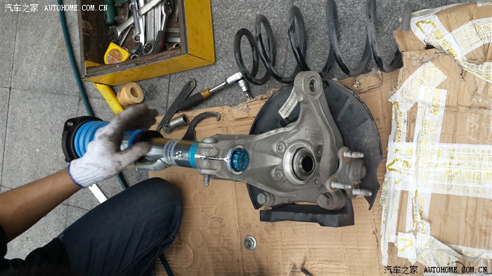 拆装前避震组装过程相当费时,要用专用的拉勾拉住原车的弹簧,才能安全将三角顶胶一套去下来。新避震组装完毕,准备上车了。