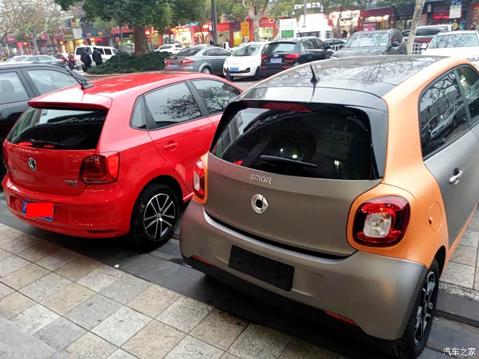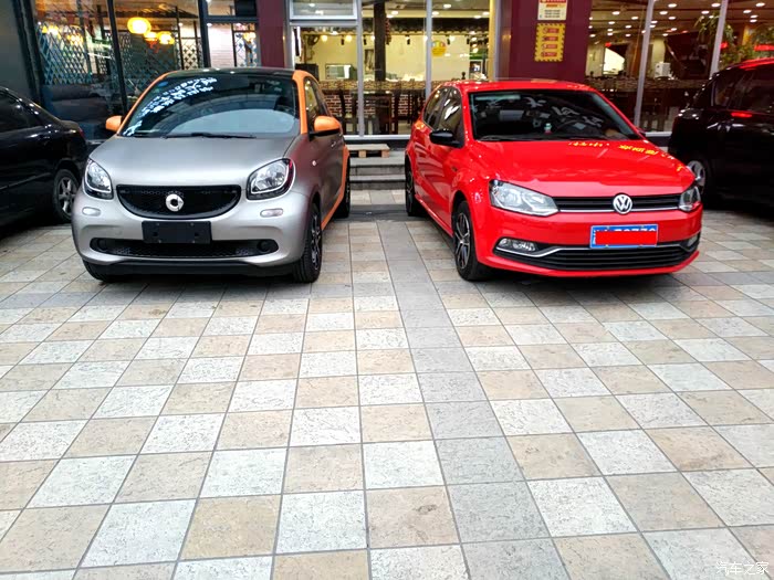 接下来看看和POLO小弟的合影吧。 是不是觉得POLO小弟比smart还小呀。其实smart车身尺寸比POLO还小。但是乘坐空间绝对不逊色于POLO。这是奔驰开发设计时候就考虑到的。 尽量做到了车往小里做,但不牺牲乘坐空间。