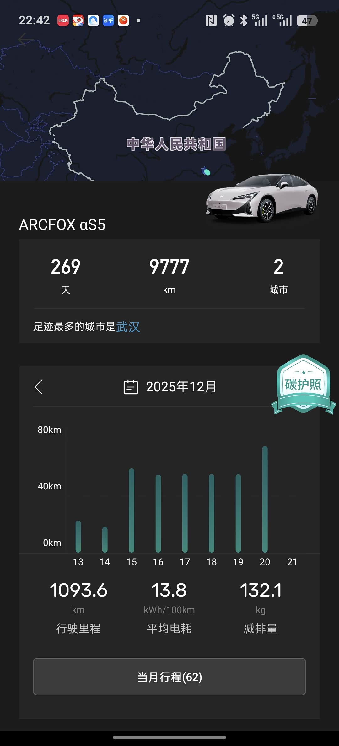 先晒几组实打实的实测数据,给各位车友最直观的参考。我的极狐S5满电官方续航560km,日常通勤主要是城市环路加市区拥堵路段,单程30km,每天往返60km。在武汉0℃左右的寒潮天气,全程开启座椅加热+方向盘加热+空调24℃,动能回收调至强档,跑了320km后表显剩余电量15%,折算下来续航达成率约65%。要知道,这个温度下,很多同级别电车的续航达成率也就50%左右,极狐S5的表现已经超出了我的预期。