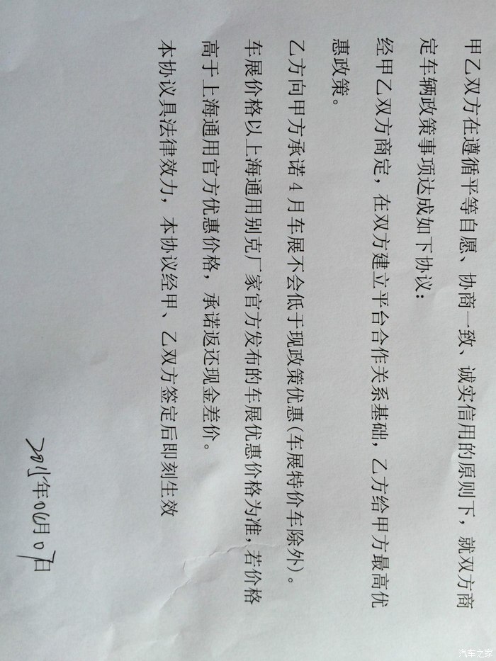 提车过程一波三折,在我看上全新英朗想要买的时候,让我一哥们弄了一张内部打折卡(具体情况不便多说)82折啊!那几天特忙两天后说卡没了!!!回头我想去先试驾,去了两家4S店看实车,都没有试驾车,不试驾怎么买?4儿子的销售说车挂牌去了,过几天就上试驾车,回家!本来想买手动豪华,看车以后心里实在放不下全黑内饰,算了一下贵1W,多了全黑内饰、手自一体变速器(虽然都说很烂)、疝气大灯,还说的过去。再次去是带钱去的准备试驾没问题就交钱,还是没有试驾车!汽车之家有个活动499元定金送500元加油卡和1000元礼包,等我买的时候活动过期了,没有就算了吧,就稀里糊涂去刷卡结果卡密码错了,银行卡锁了···交了900定金,回家解锁等过了清明节,再次带卡到了4S店,竟然还是没有试驾车!这家4儿子店服务真的不咋滴···着急提车我就认了,刷卡交钱全款!问我买什么保险?我说我自己买不在你们这买,那女的脸都绿了,我查了一下人保财险网上报价差那么几百块,想想都不容易让她提点钱吧。(除了盗抢险和自燃险其余都要加上车船使用税共计5304元!)4月9号有春季车展,4儿子说所有的都一样,送8次免费保养,本身2次,4儿子送6次,全车贴膜、底盘装甲(换成倒车影像和导航说没件···)、下护板,我要求签了报价协议: