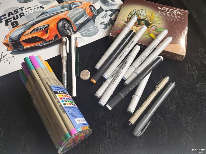 和以往一样,本次运用康颂素描纸、三菱铅笔、直尺、法卡勒色彩勾线笔、法卡勒二代马克笔、雄狮色粉、三菱高光笔、樱花橡皮。本次创作也是重新找回当年的感觉,也是本人熟悉马克笔的一个阶段。