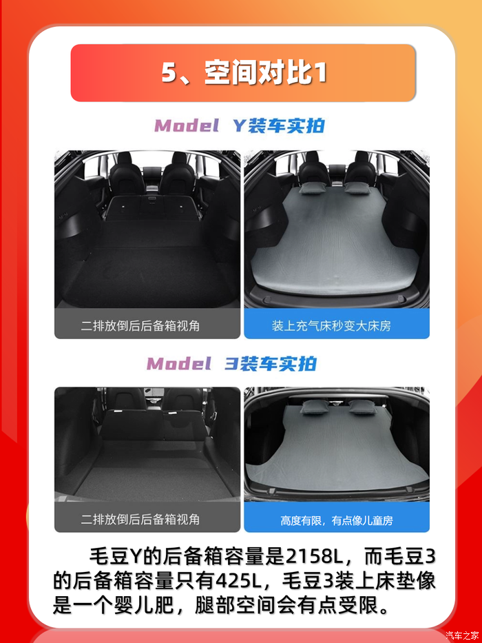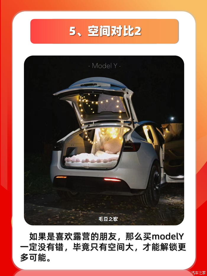毛豆Y的后备箱容量是2158L,而毛豆3的后备箱容量只有425L。如果是喜欢露营的朋友,那么买modelY一定没有错。