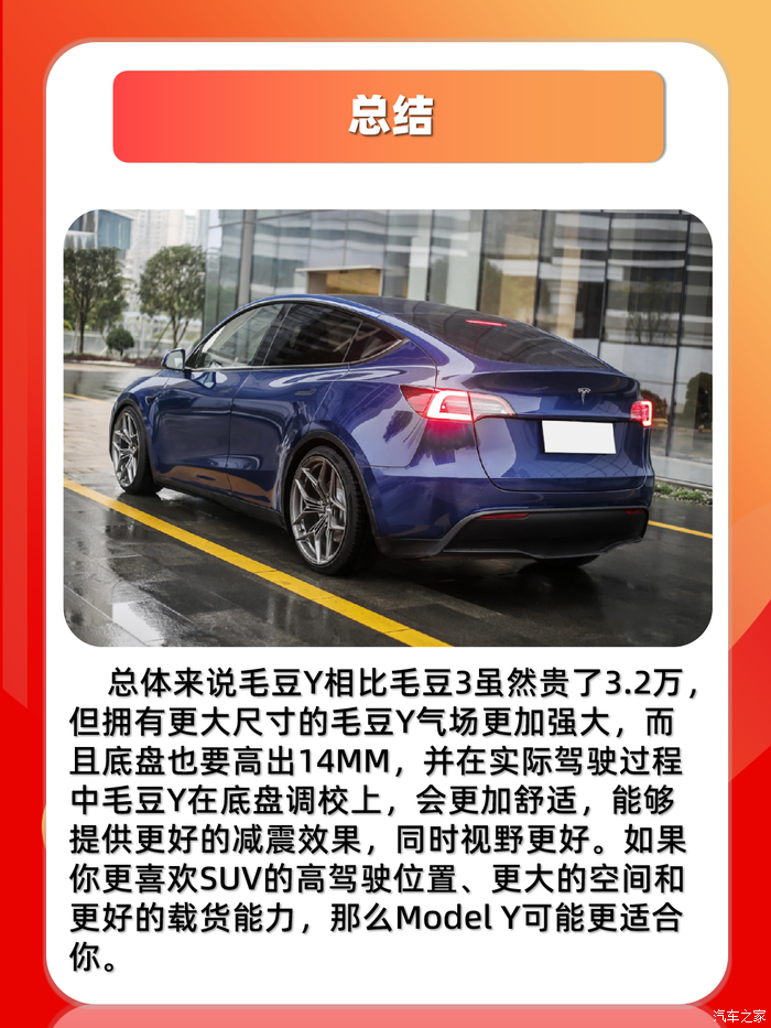 总体来说毛豆Y相比毛豆3虽然贵了3.2万,但拥有更大尺寸的毛豆Y气场更加强大,而且底盘也要高出14MM,并在实际驾驶过程中毛豆Y在底盘调校上,会更加舒适,能够提供更好的减震效果,同时视野更好。如果你更喜欢SUV的高驾驶位置、更大的空间和更好的载货能力,那么Model Y可能更适合你。