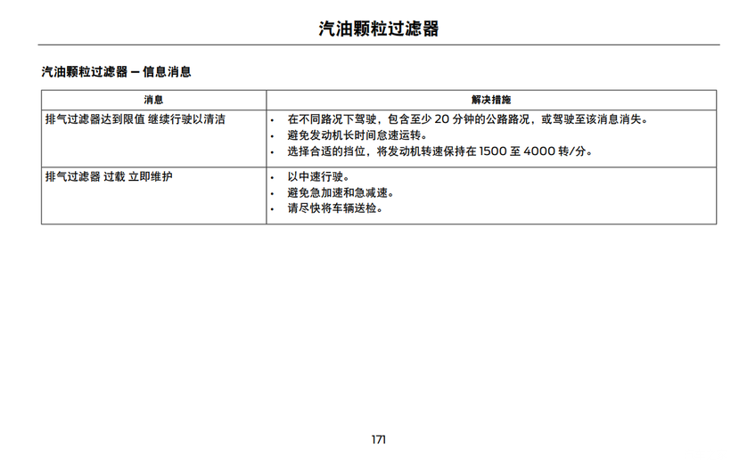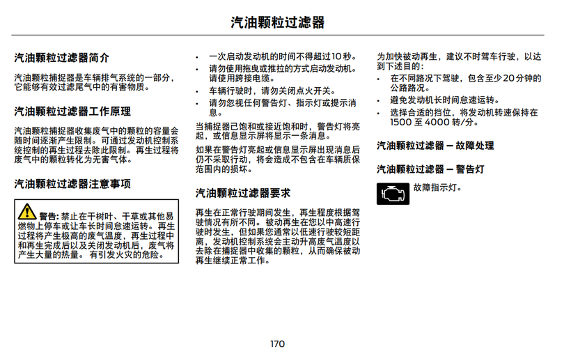 翻开2025款林肯航海家说明书,第170页(不同说明书版本所在的页码可能有区别,本文以2024年9月版为例),有一节专门介绍“汽油颗粒过滤器”。