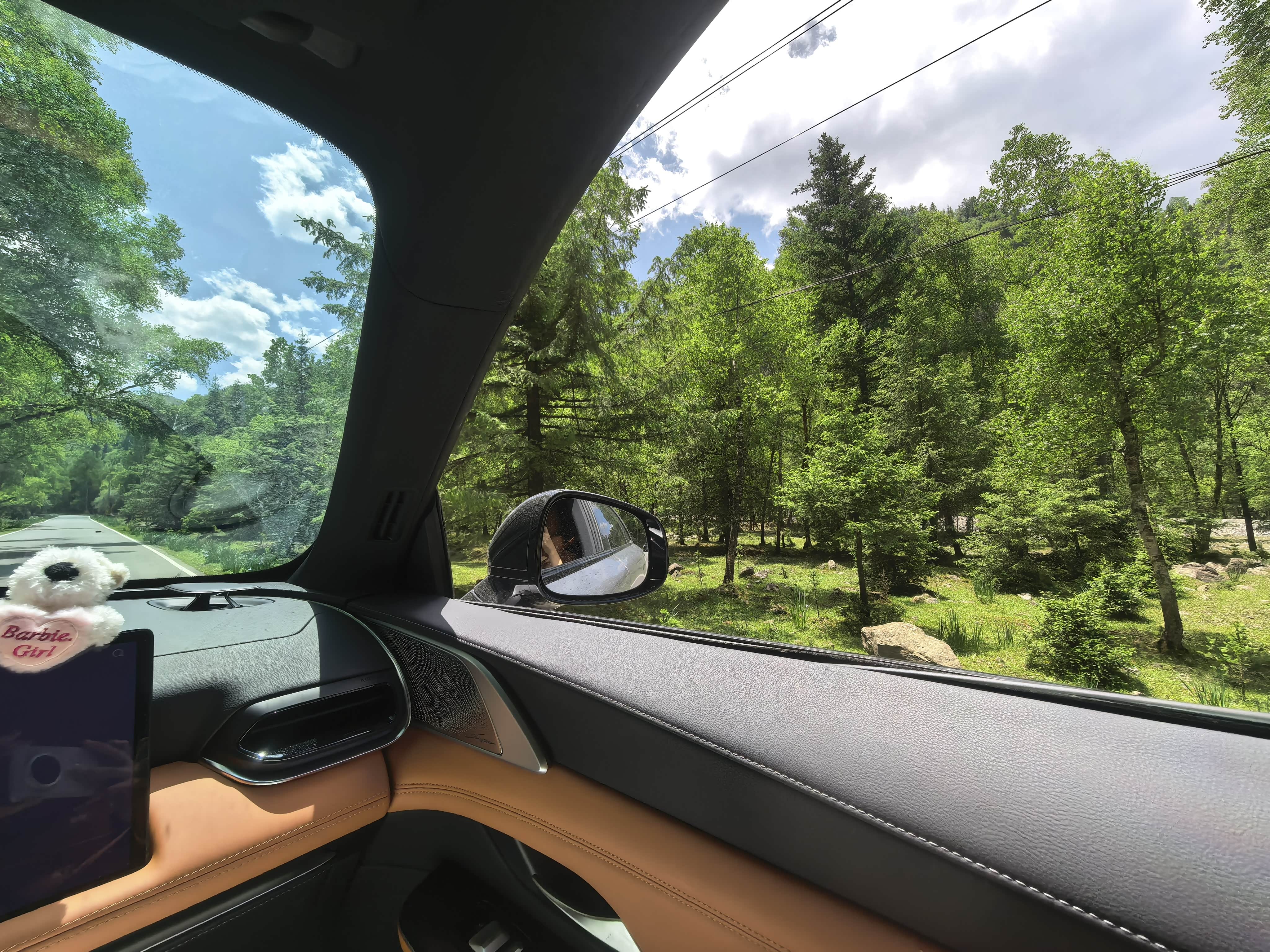 这次我选的青海互助北山国家森林公园,环境很不错,露营好出处,沿途还可见雪山、森林、溪流交织的壮丽景观,开G9穿行于山间公路,看到好看的风景就停车休憩,享受全景天幕带来开阔的视野,一抬头,满眼都是超开阔的风景,感觉伸手就能摸到,配合音响放起轻柔的音乐,靠在软软的NAPPA真皮座椅上,阳光透过天幕暖暖地照着,暖洋洋的,就这么听歌看风景,简直是和大自然亲密约会爽翻了。