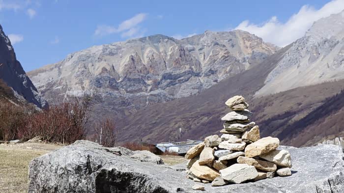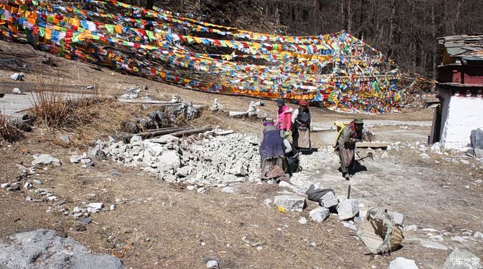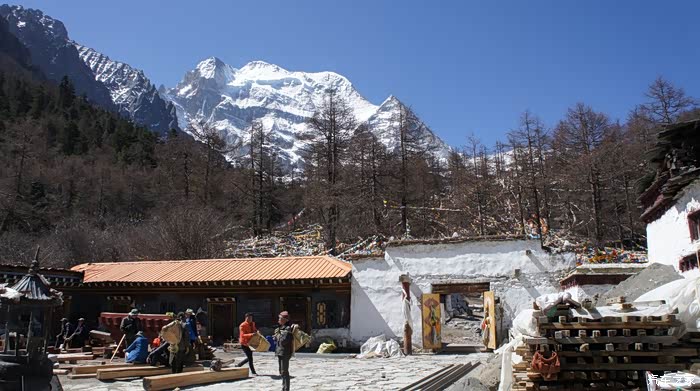 在离开冲古寺时,两位当地修庙的年轻人抬着装满大石头的框子走过来,他们主动停下等待,让我先拍照。