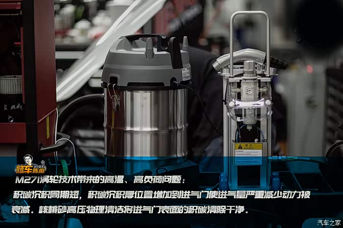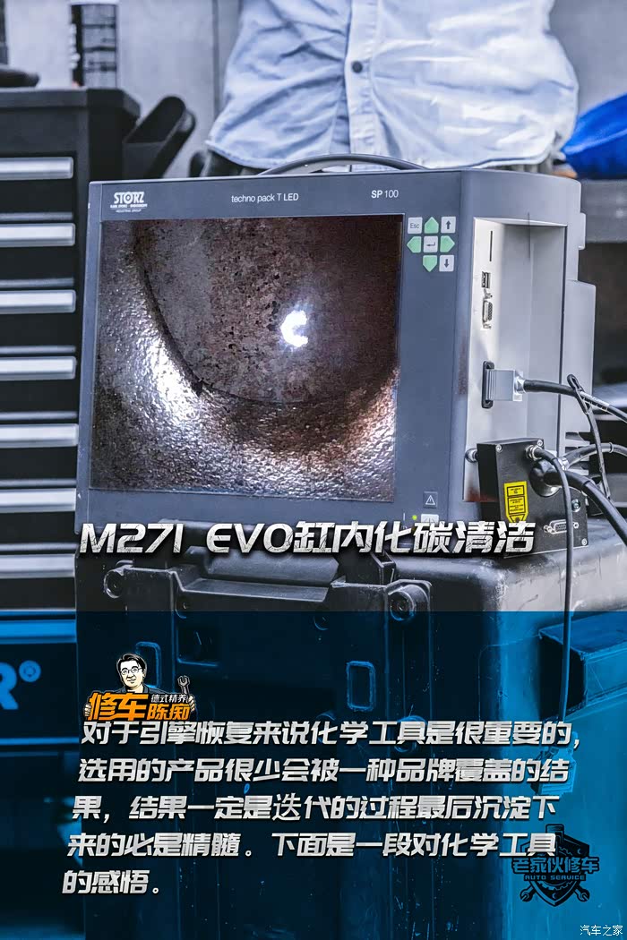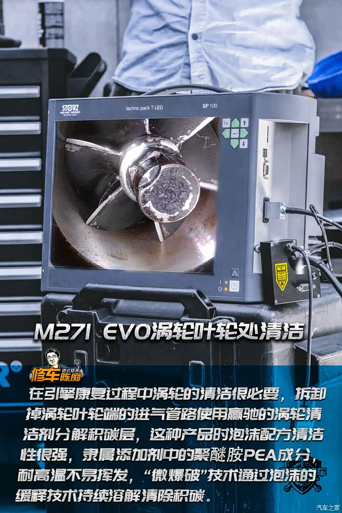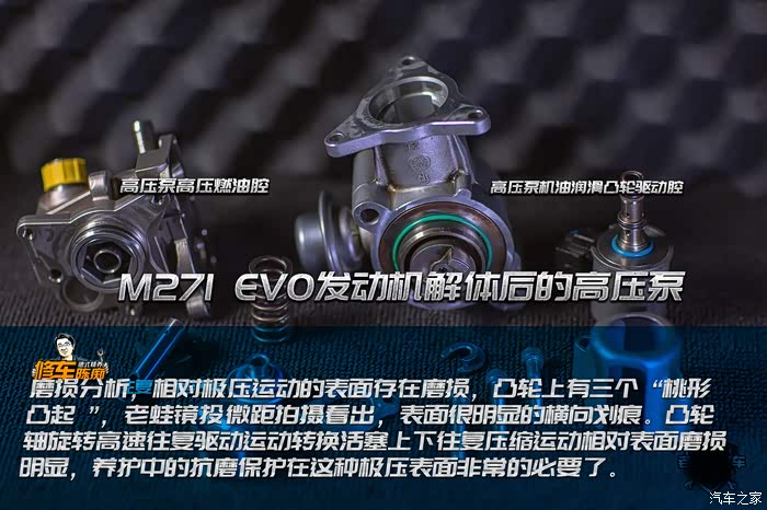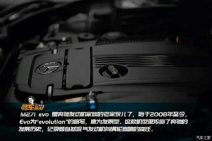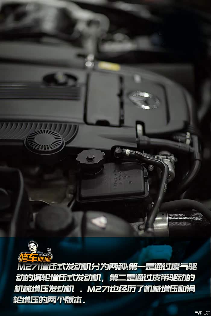 「通过废气驱动的涡轮增压式发动机」 对于奔驰的涡轮增压发动机就要打开一段奔驰被久久封存的记忆,M198搭载的那台300SEL直列发动机,首次使用了博世的高压燃油直喷技术,在化油器的那个年代引擎动力输出几乎提升了一倍。之所以奔驰久久封存记忆,还是在当时技术瓶颈无法突破。在电控技术萌发的时代,燃油加压系统和喷油器是一体的,注入气缸的汽油的控制精度无法解决,未燃烧的汽油顺着缸壁流入油底壳将机油稀释,行驶不到2000公里就要更换机油,所以300SEL量产之后就被久久的封存起来。 M271 evo 是奔驰发动机家族的老家伙儿了,始于2008年至今,Evo为“evolution”的缩写,意为发展型。这款机型里浓缩了奔驰的发展历史,记录着自然吸气发动机向涡轮直喷的变迁。