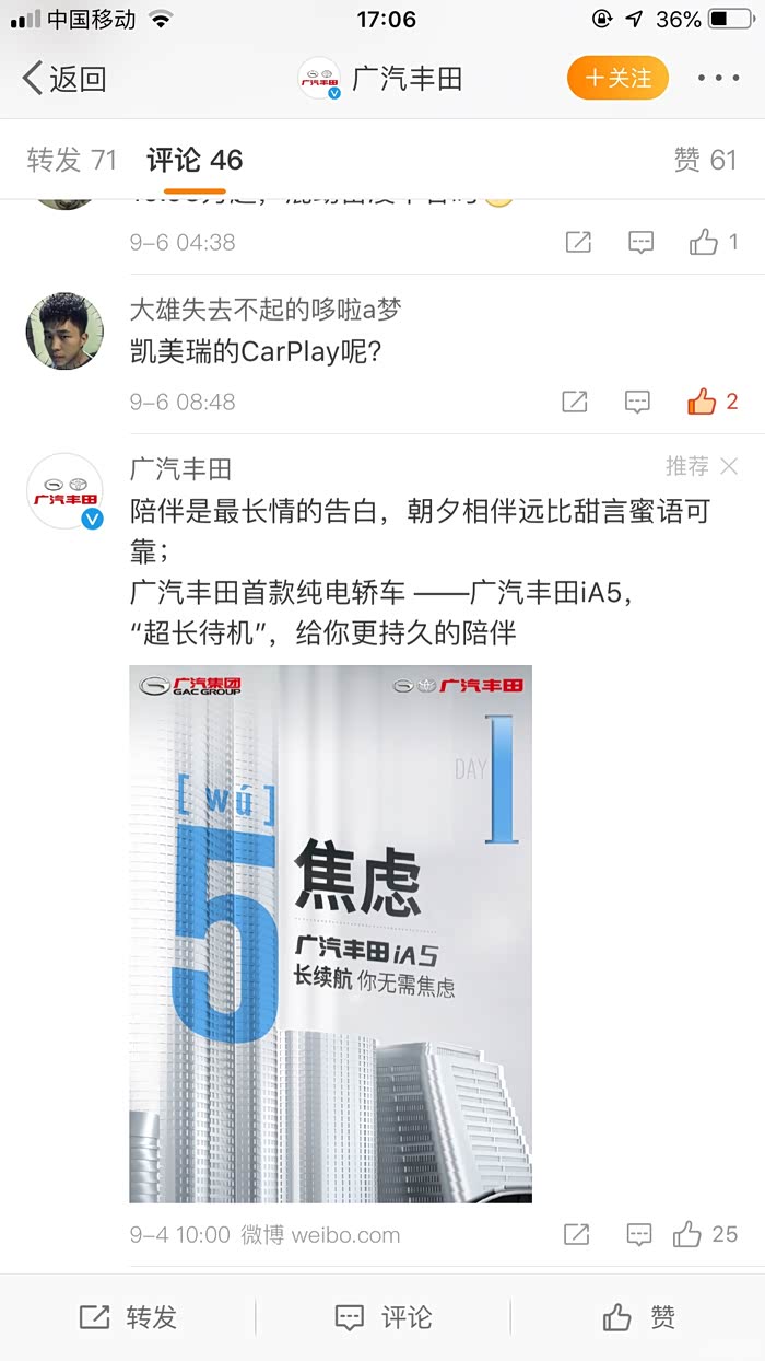 haha看到有人评论广丰微博都把carplay这个词屏蔽了。。