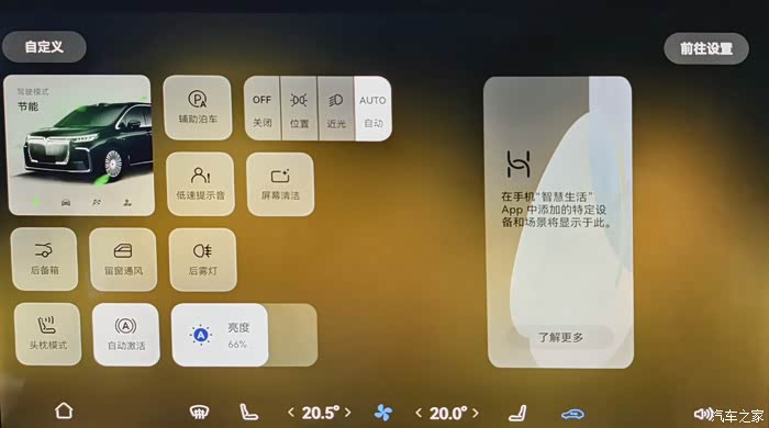 底部dock栏显示的是主页,空调控制、座椅控制、音量