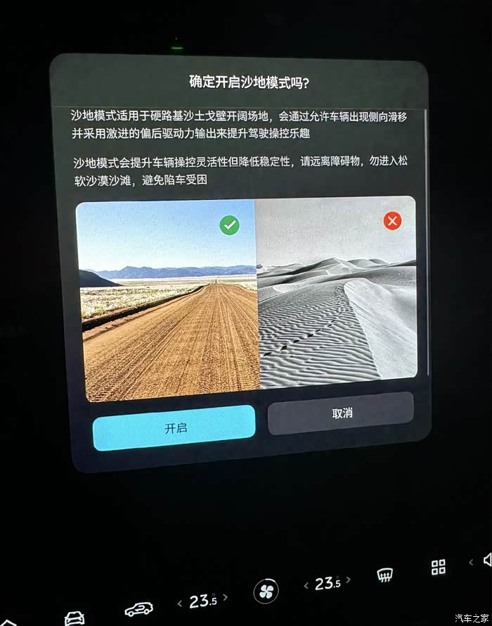 在中控屏里点行车驻车这一栏,然后直接点击沙地模式就可以打开。蔚来的沙地模式适用于较紧实的沙土和戈壁路面,太厚太软的沙还是不行的。