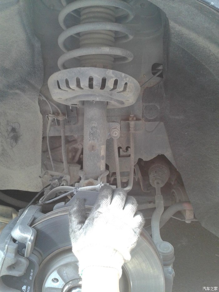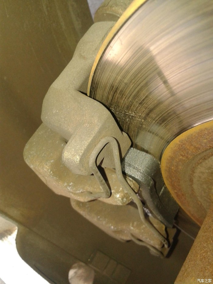 左前轮刹车片安装 只有这个轮子的刹车片有磨损的报警线束链接线,但到目前为止还没有听到或者仪表盘显示刹车片磨损的报警,左前轮刹车片没有到极限就没有声音,还是没有什么效果,听说12年以后的车就没有这个配置了,其实也没有什么大用。