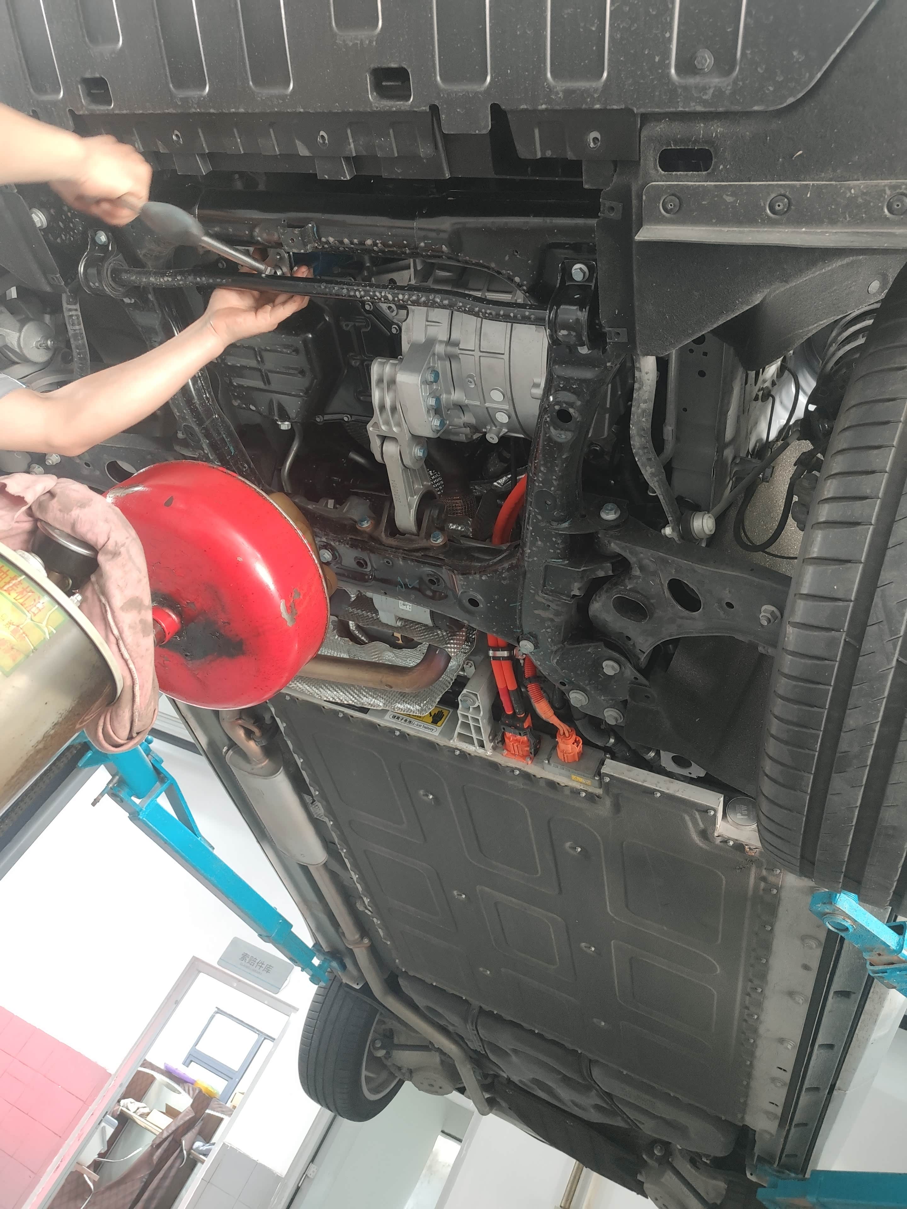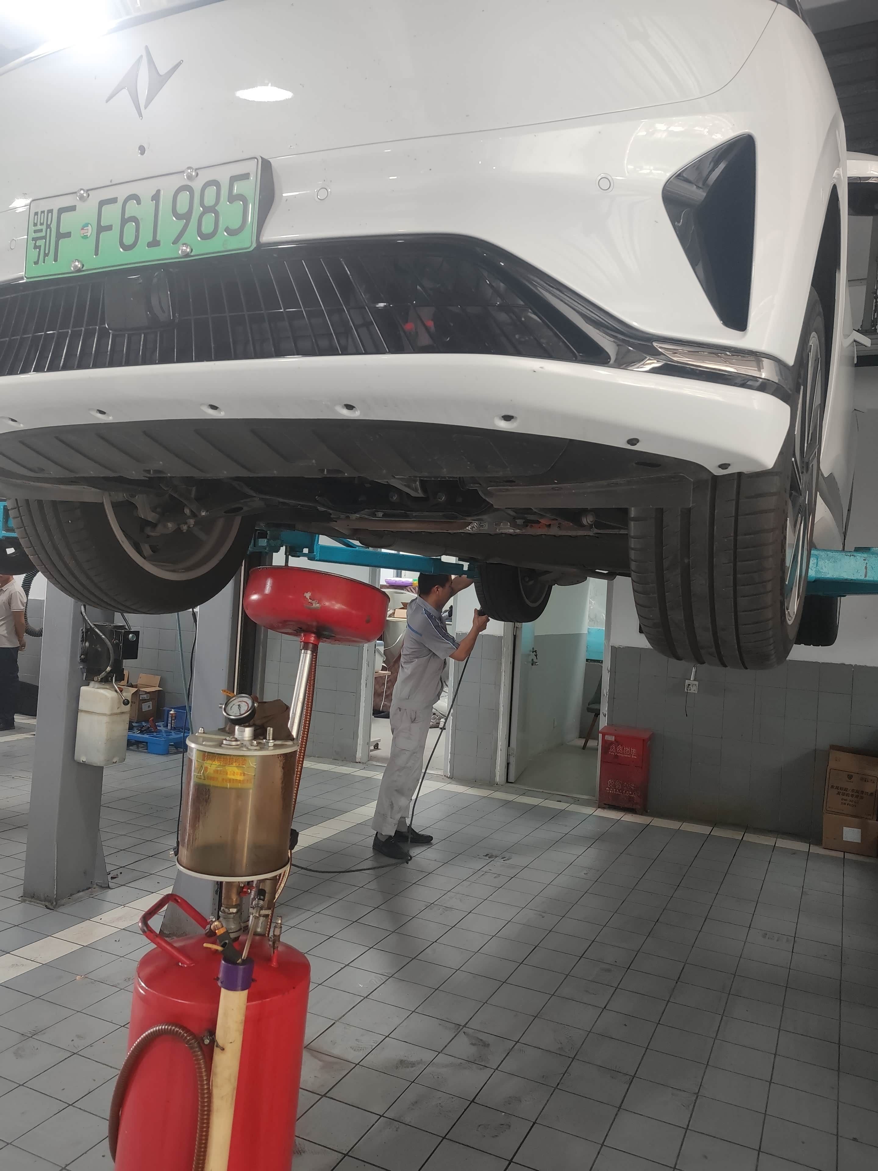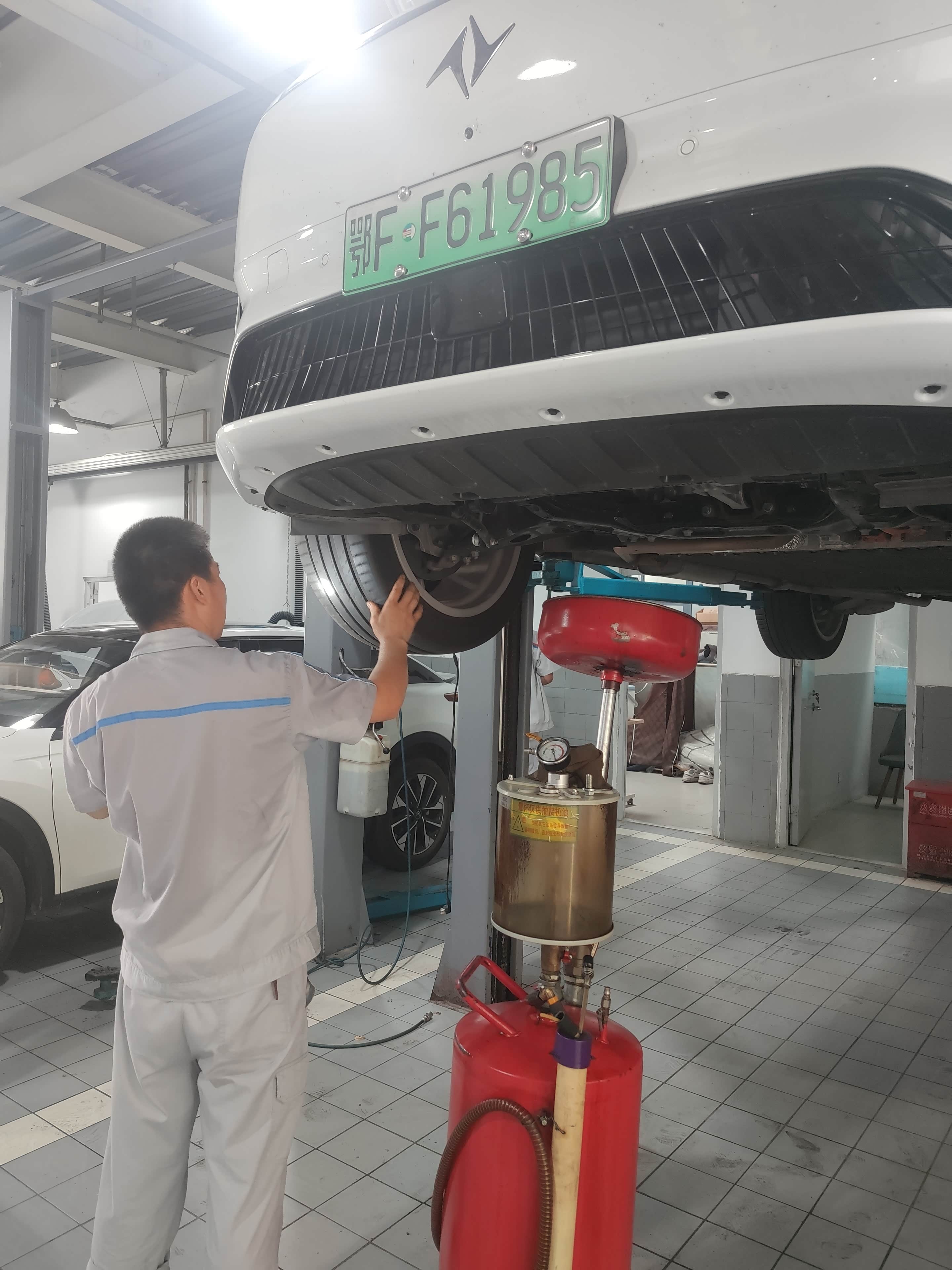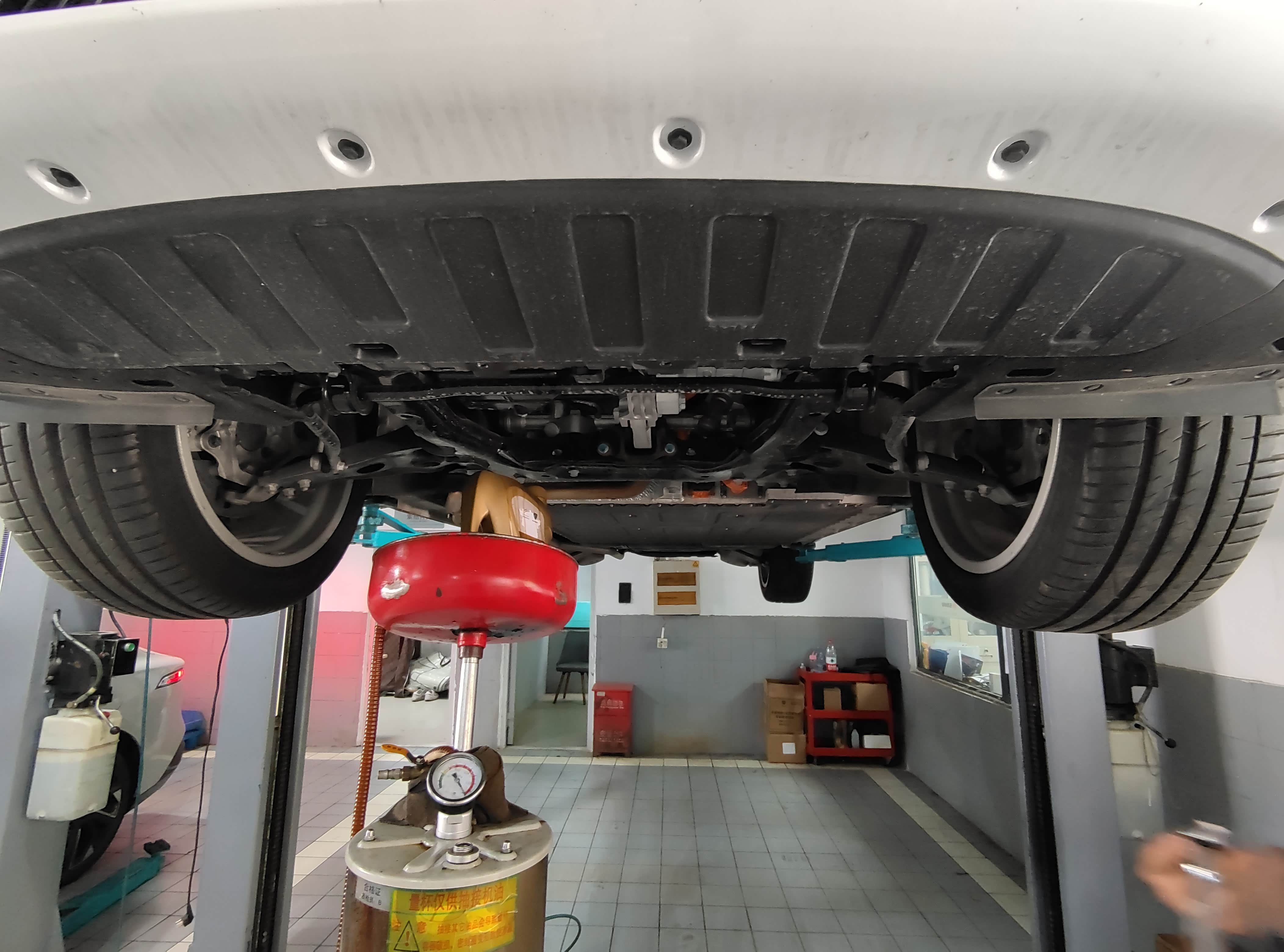 到达4S店已经十点多了,在售后做好登记后,就开始排队上工位,这里提醒大家一定要带上车钥匙,因为我已经习惯了手机解锁,所以我没带,只能全程拿着手机陪同保养,刚好我也趁机看看底盘和拍点照片