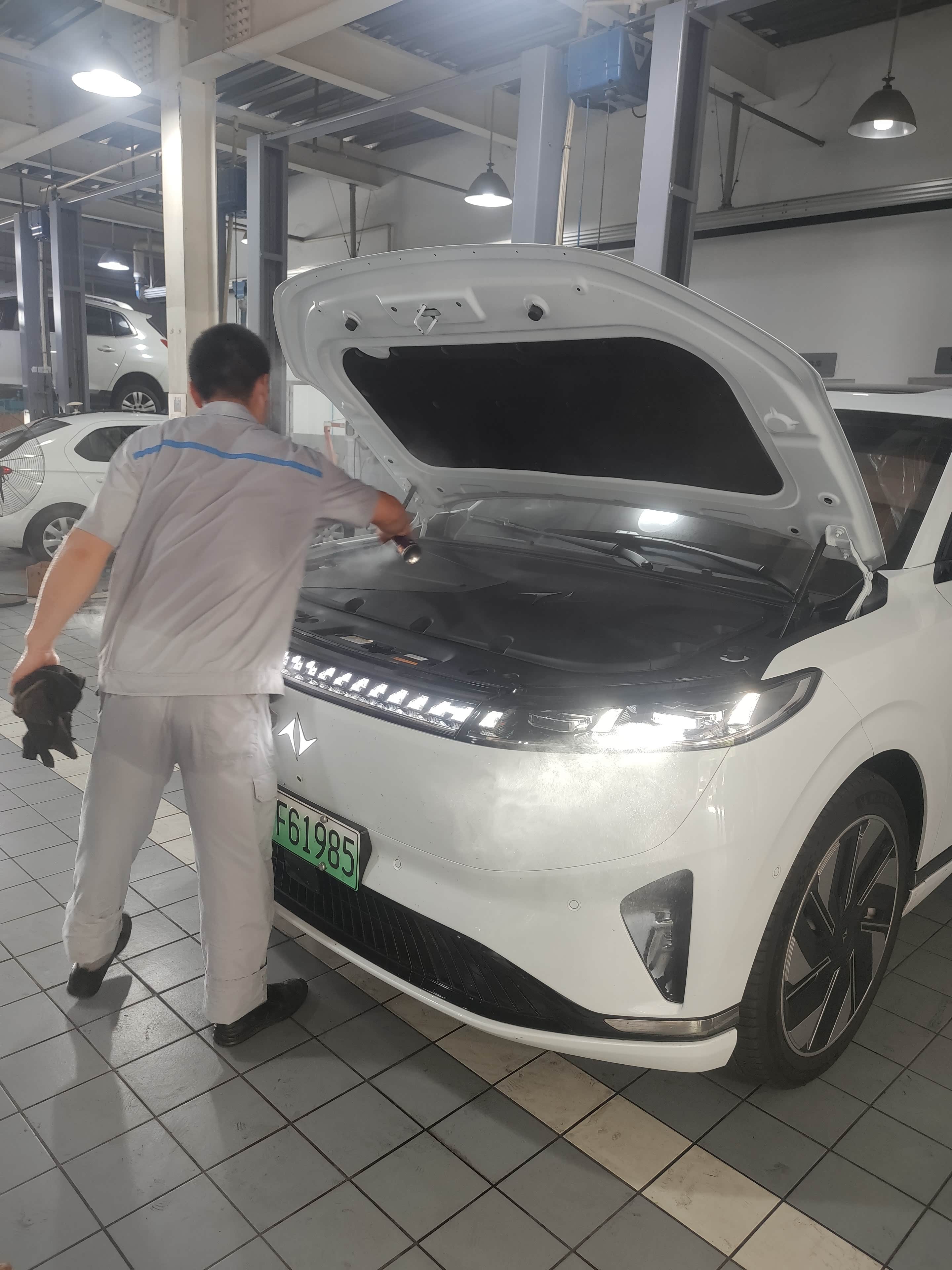 维修保养的车间挺大的,保养师傅看我没带钥匙,就想办法尽快把前面车挪走,让我尽快把车挪到车间里去
