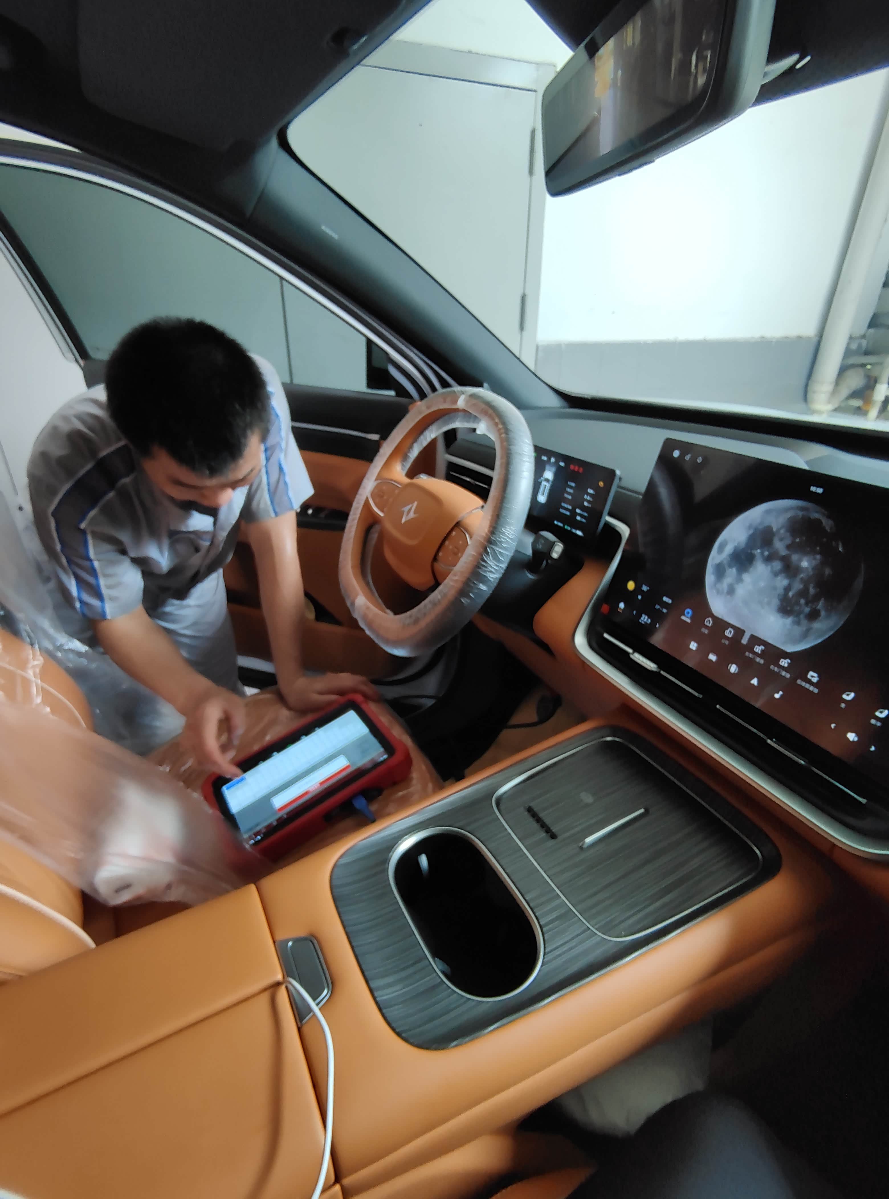 等了半小时终于轮到我了,保养师傅先给主驾座椅和方向盘套了个保护膜,主驾脚垫还铺了张牛皮纸,第一步这个就叫专业