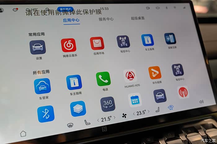 车机内置丰富的应用生态,包含华为音乐、华为视频、收音机等常用应用。