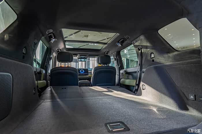 后排座椅是放倒的,直接就是一张双人床,空间达到2112L,观察了一下只有微小的角度和全平几乎没区别。配合上全景天窗,我已经幻想和心爱的人躺在无人区里看银河的场景了。