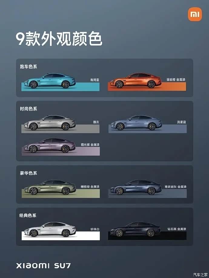 小米SU7提供同级最丰富的9种外观颜色供大家选择,包含“海湾蓝”、“雅灰”、“橄榄绿 金属漆”3款免费色,及 “流星蓝”、“珍珠白”、“熔岩橙 金属漆”、“寒武岩灰 金属漆”、“霞光紫 金属漆”、“钻石黑 金属漆”6款付费色,售价7000元。不仅颜色更丰富,在抗氧化、防腐蚀等性能方面,我们也有自信在行业中有领先的表现,自正式发布以来,深受大家喜爱。