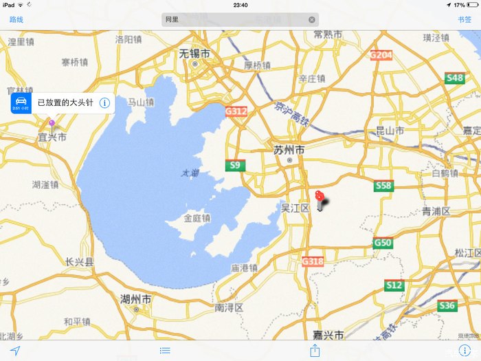 本来,导航指示的路线,去宜兴是走南线的,结果由于偶过于自信,走了北线。然后,回来的时候,觉得走G2不如走S12也就是S32申嘉湖高速顺当,顺便还可以西塘晃晃。最后整个行程就是绕了太湖的一圈。