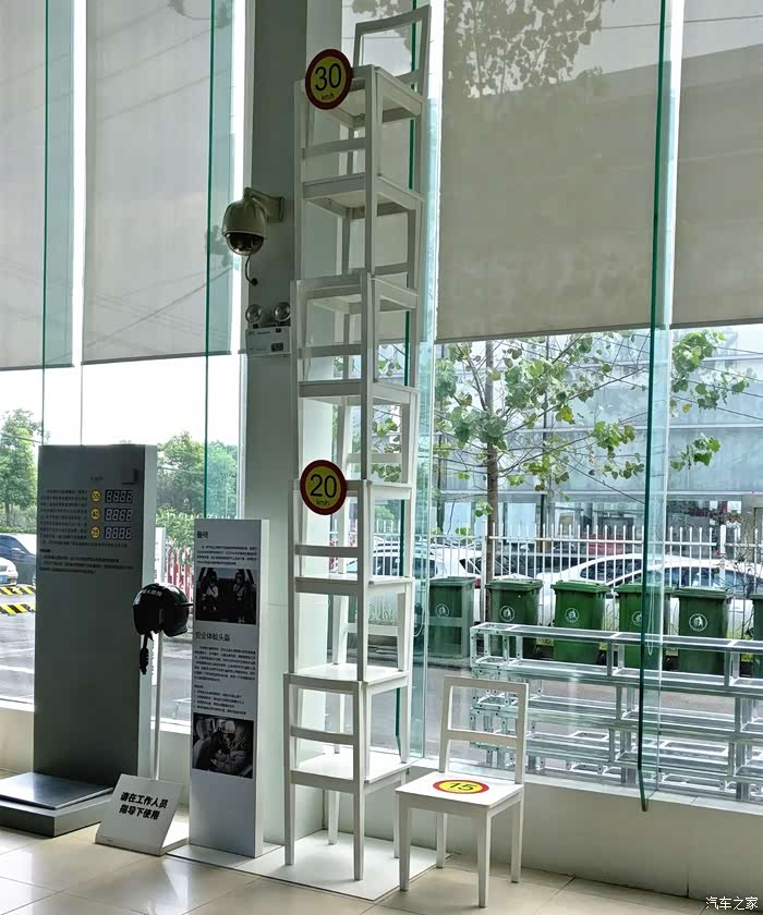 沃尔沃的4S店里通常都有这几样器具,椅子搭的高高的,中间20KM/H的牌子意思是当你站在那个椅子的高度做自由落体,接触地面的冲击力就相当于车速20KM/H的撞击力,顶端椅子的高度,就代表从那个高度做自由落体相当于车速30KM/H的撞击力。旁边的头盔是用于模拟婴儿头部,当成年人带上这个头盔,就相当于婴儿颈部承受头部的重量的比例。因为婴儿的头颈部没有发育好,婴儿的颈部所要承受的重力,比成人的比例要高的多,所以背向式安全座椅非常必要,否则当出现事故撞击时候,因而颈部无法支撑头部重量,容易造成头颈部受伤。
