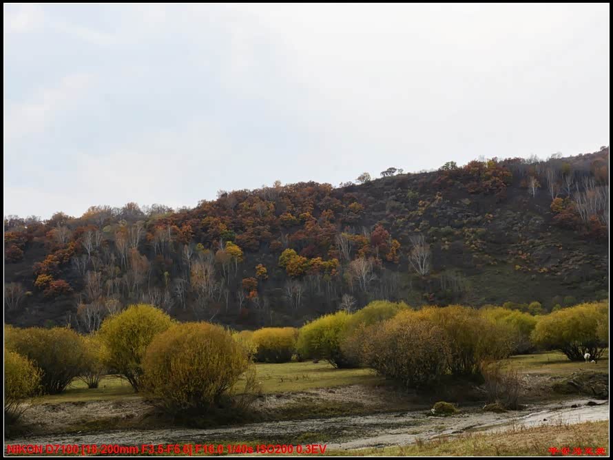 现在山上只剩落叶松的金黄,边上灰色的树应该是白桦林,若九月中下旬来,也是一片金黄,山上的颜色会更丰富。