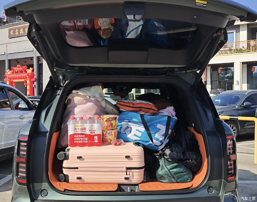 空间绝对是这辆车的王牌。4米9的车长,2880mm的轴距,大五座的设计真的太香了。我身高178cm,调整好驾驶位之后,后排腿部空间还有三拳多,跷二郎腿完全没压力,后排地台是纯平的,就算坐三个成年人也不挤,一点不会觉得憋屈。后排座椅还能电动调节到137度躺角,长途回老家的时候靠着特别舒服。后备箱常规容积就有720L,放两个28寸行李箱和一堆露营装备完全没问题,后排座椅放倒之后可以铺上气垫床,周末露营直接躺里面休息,连帐篷都省了。