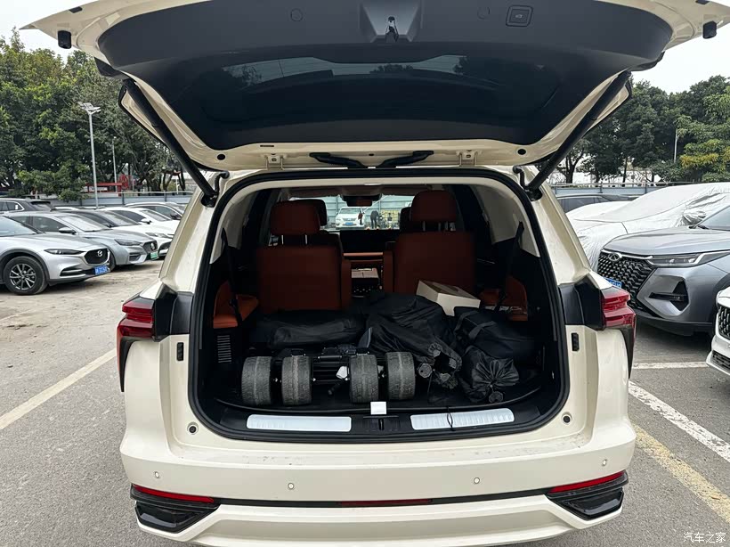 提车时送的脚垫和后备箱垫很贴合,不用额外花钱买。三排2+2+2座椅布局,大部分时间我在开,用不上第三排就直接把座椅放倒,后备箱挺能装。第二排的零重力座椅是老婆的最爱,通风加热功能在广东的冬天和夏天都太实用了。