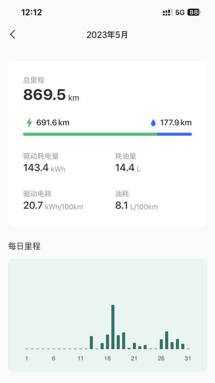 才接车没几天跑了一次纯油有先、油耗8点几,2.4吨重量10个油耗左右,我自己是接受的,毕竟1.5自吸我都能开出5-6个油出来,电耗20左右、我上车必须因为、通风、按摩、空调全开,目前分段用电3.6一度、所以也不在乎了!