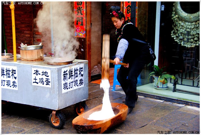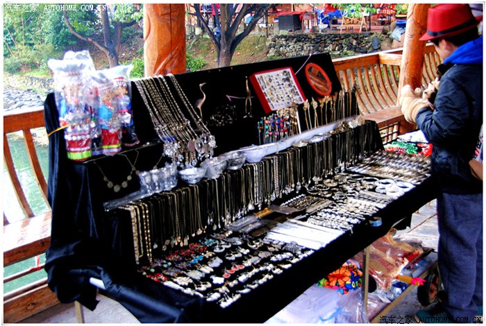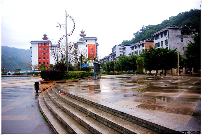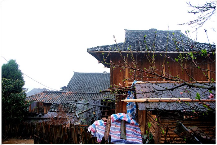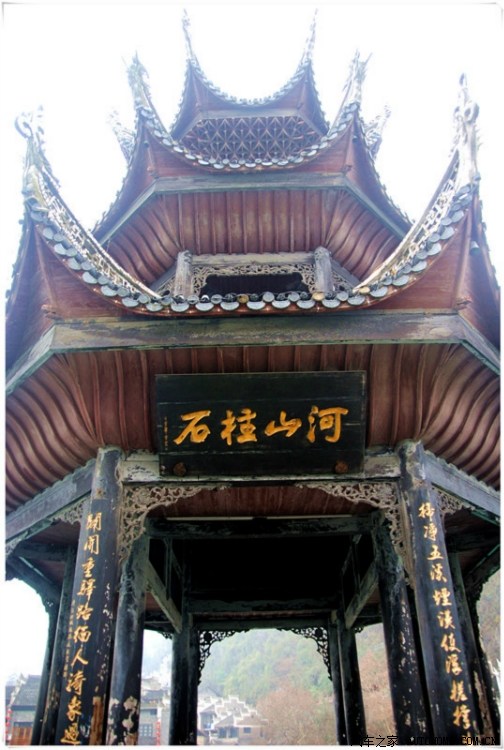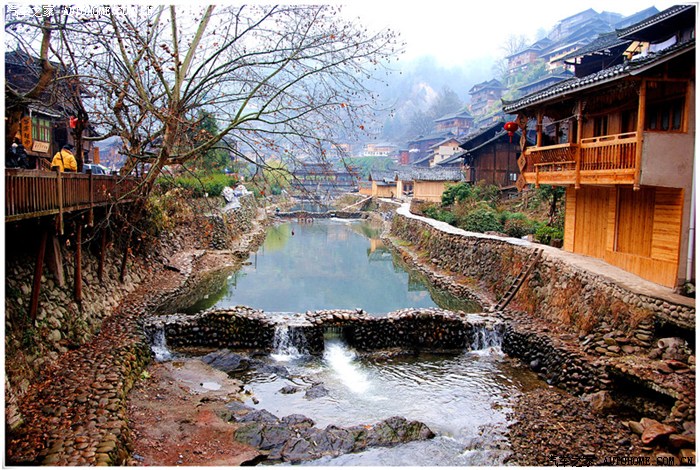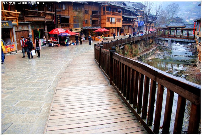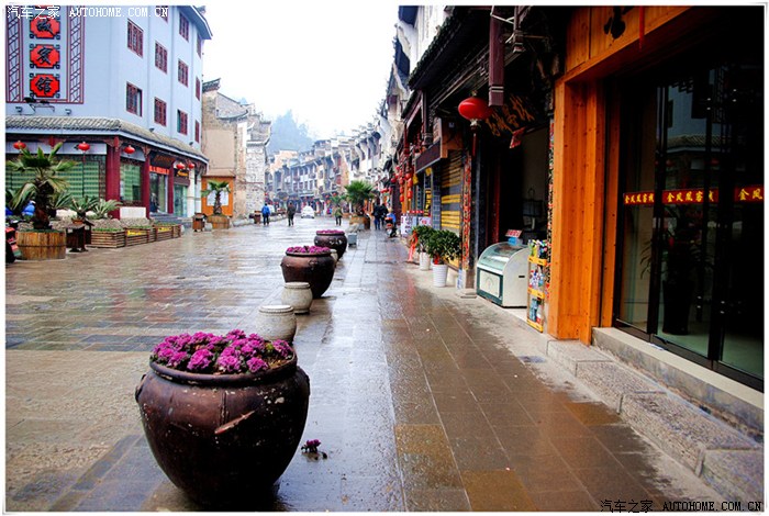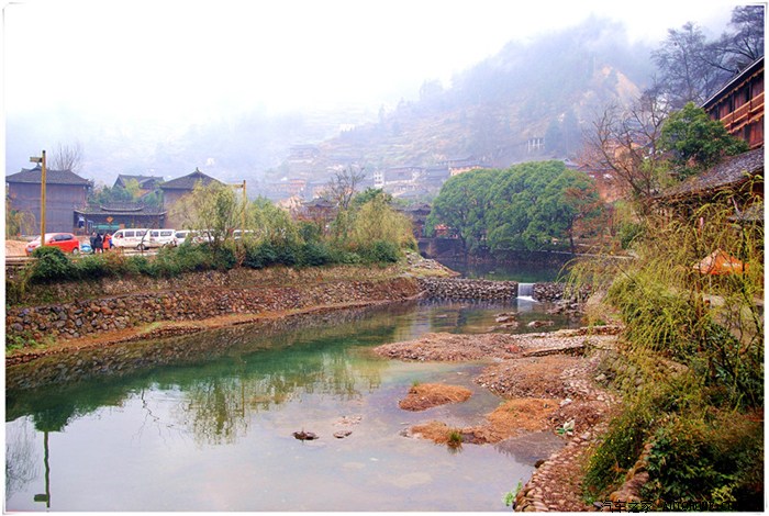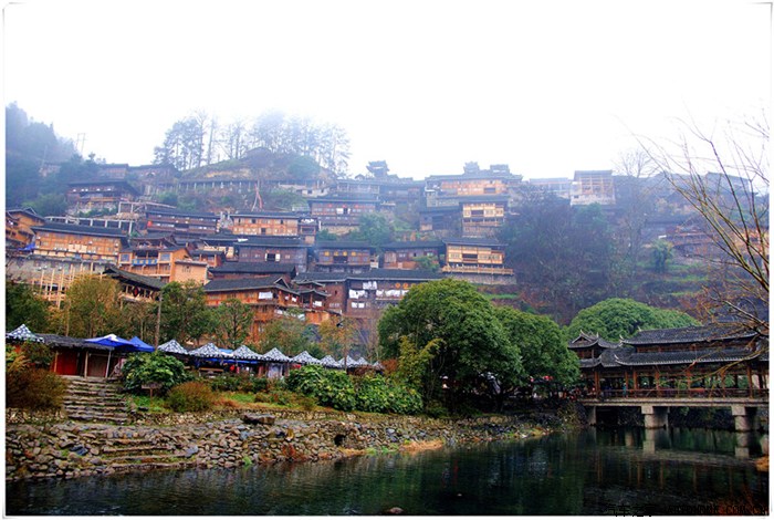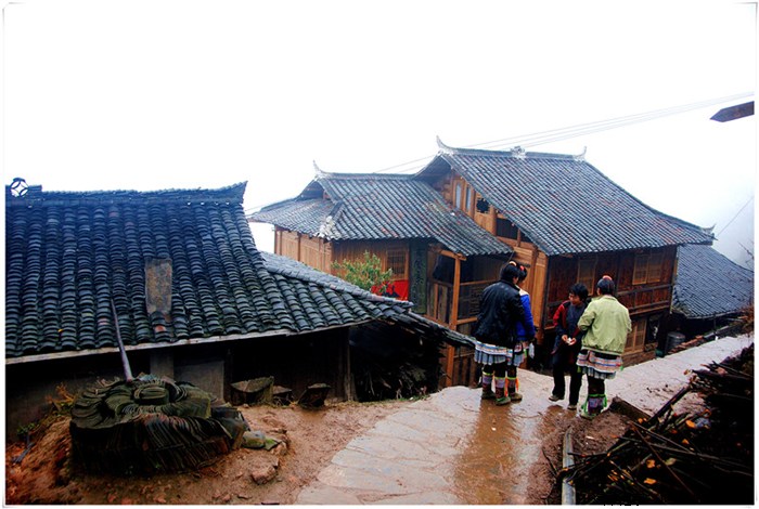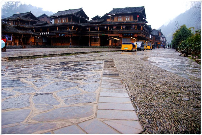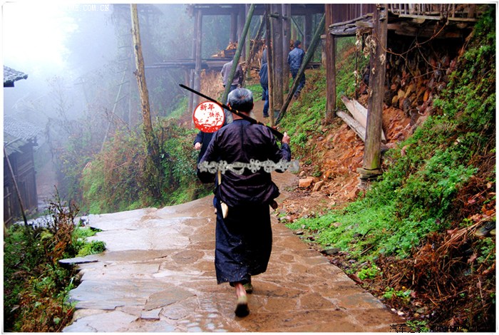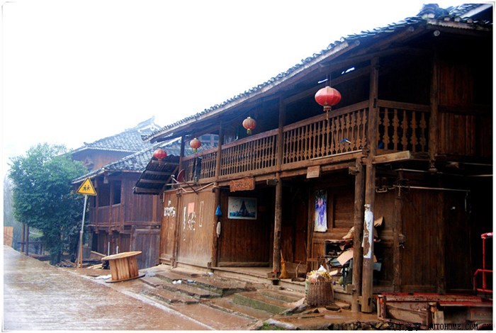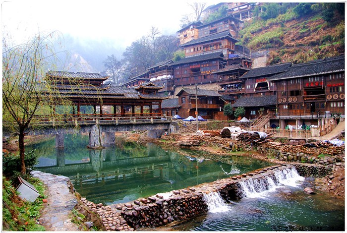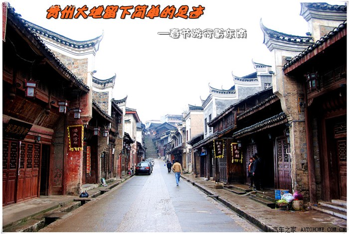 天空似乎不作美,小雨为古镇蒙上了一层轻巧的面纱,却别有一番风味,屋檐边上不住滴下的水滴,连成一条直线,使天地同为一体。地上薄薄的浅水,正在洗刷昨日留下的凡尘,留下如似仙境。漫步于古街上,两眼不住的望着两旁,静静的体验来自江南的气息的同时,也在享受贵州大地上的清爽。古镇没有熙熙攘攘人群的繁杂的繁杂,只有一种特殊的宁静。细看左右商家,他们的热情也为这宁静注入了一丝快活的气息,他们似乎不是为了简单的糊口而拼命赚钱,而是在享受古镇的同时为自己带来片刻的宁静,没有刺耳的吆喝,也没有拉扯的招揽,只有一张热情洋溢且带有丝丝微笑的脸庞在注视着小镇,快乐向上的迎接生活。