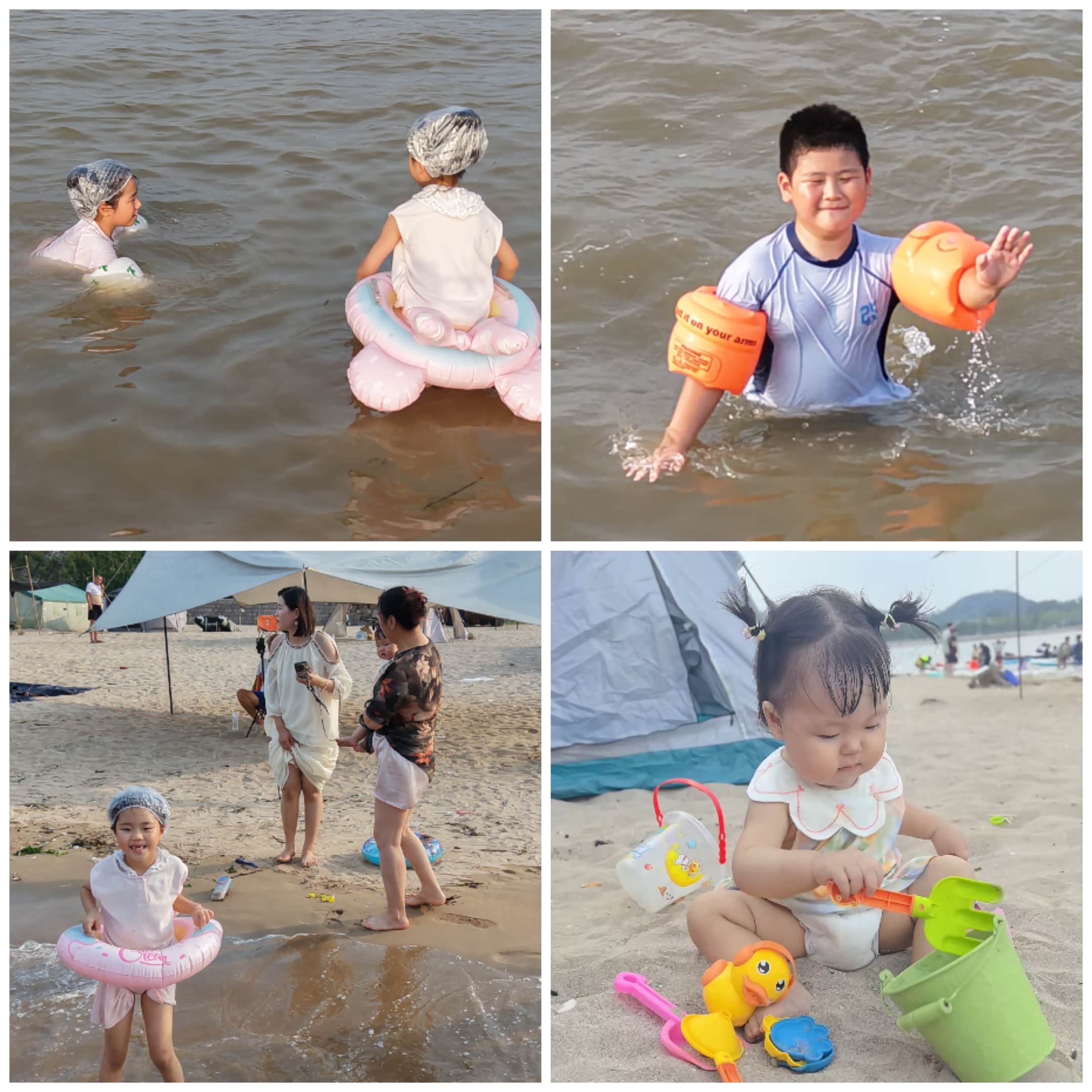 午后的时光最是热闹,孩子们也都吃饱喝足,蹦蹦跳跳格外有劲,本来都不敢下水的一个个的都着急忙慌的换好装备跃跃欲试,只留着我家老二独自在沙滩上挖沙子,现在是不懂事,等长大点了哥哥姐姐不带她玩不哭才怪