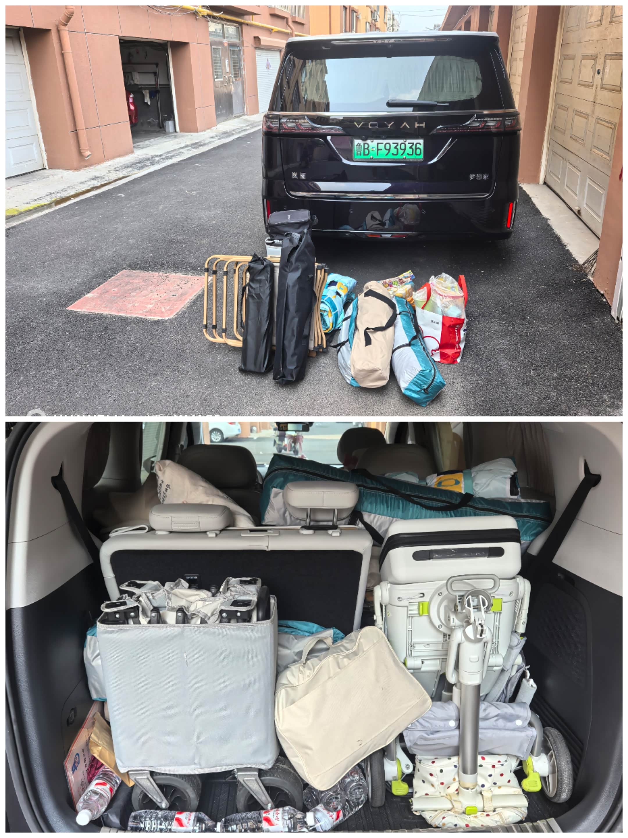 盛夏的周末,阳光正好,风也温柔,由于我们县城这边离着崂山比较远,所以计划提前一天赶到崂山,找个民宿住下,下午早早的便在车库里收拾好随行的露营装备,天幕、帐篷、小推车、蛋卷桌等等,都是在岚图商城里买的,还有孩子们挖沙工具、呲水枪等玩具,满满的一堆,好在梦想家的后备箱空间足够大,装下了一家人的出行装备