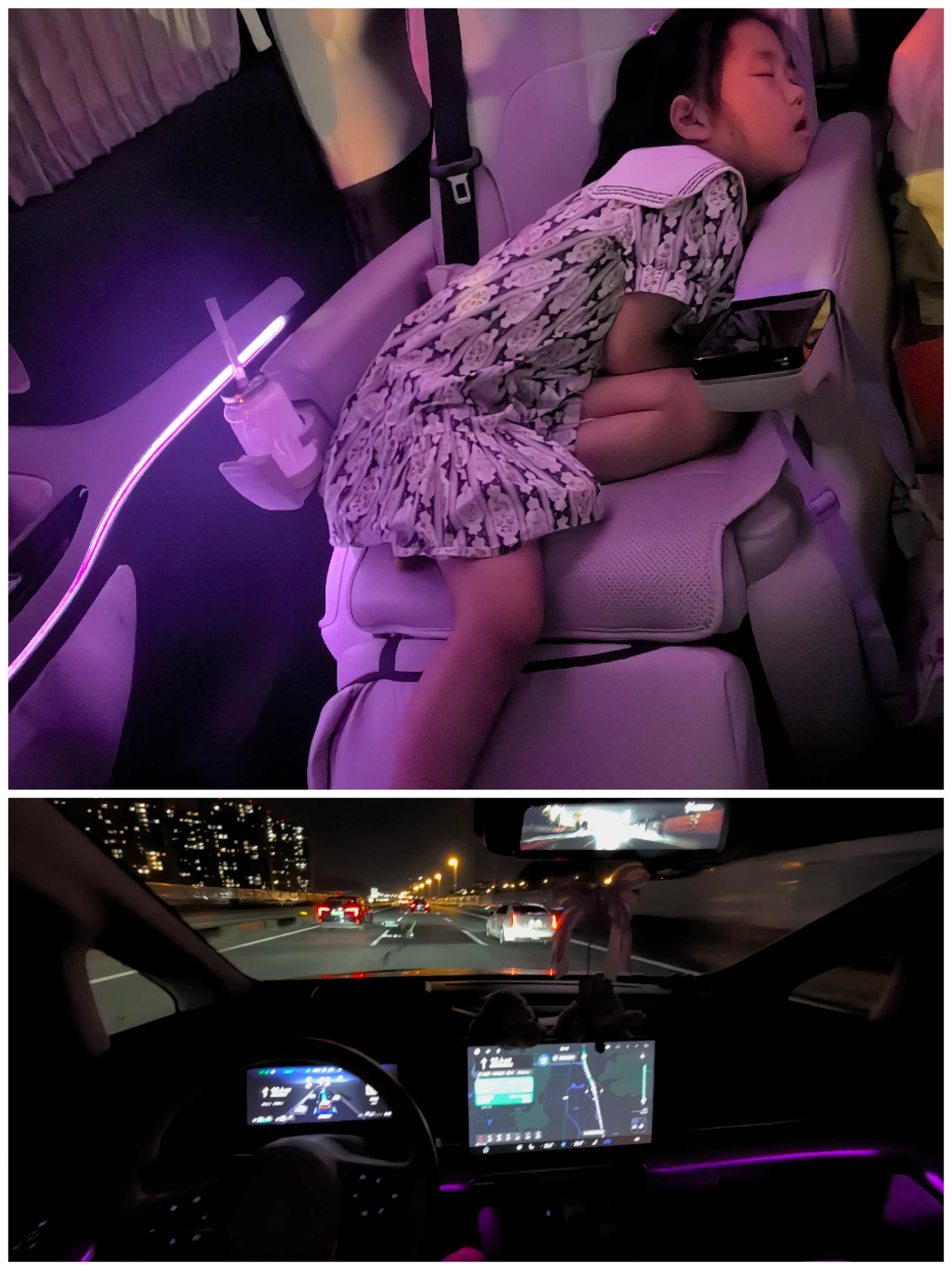 返程时,孩子们累得在车里睡着了,梦想家的双层隔音玻璃加之整车的静谧性很好,高速行驶时除了轻微风噪,几乎感受不到外界的嘈杂,平稳的行驶让孩子睡得格外安稳,我也累了一天了,好在梦想家乾崑版的智驾领航辅助功能强大,192线激光雷达配合全车感知硬件,不管在黑夜还是雨天,表现依旧给力,自动变换高速、变道超车、根据车流跟车行驶等非常省心,老爸开着雪铁龙C6跟在后面,可惜了燃油车没有智驾领航辅助功能