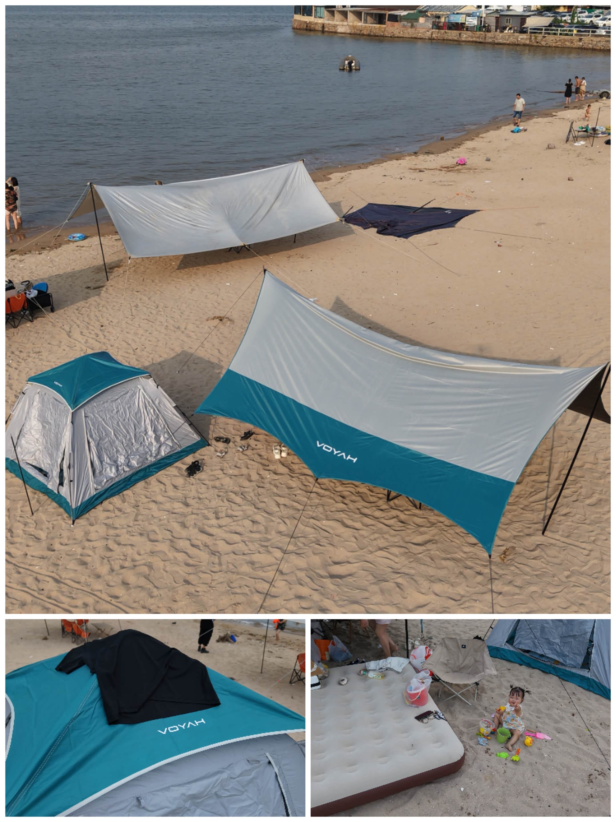 把装备用露营车拉到沙滩上,我和老爸负责搭建帐篷和天幕,商城的帐篷设计格外贴心,一键式卡扣式弹开不用费太多力,天幕也是按部就班的搭建了起来,不得不说这个黑胶天幕,哪怕没有阳光的直射,坐在天幕下边仍然能感受到明显的凉意,加厚的黑胶涂层起到了很大的作用,隔绝紫外线的同时能够有效阻隔外界的热量侵袭,便携式充气床垫伸展开后打开充气阀门,便能轻松完成全自动充气过程,还有一键放气功能,特别方便实用,天幕底下蛋卷桌、月亮椅,坐在下边吹着海风喝着茶,别提有多惬意