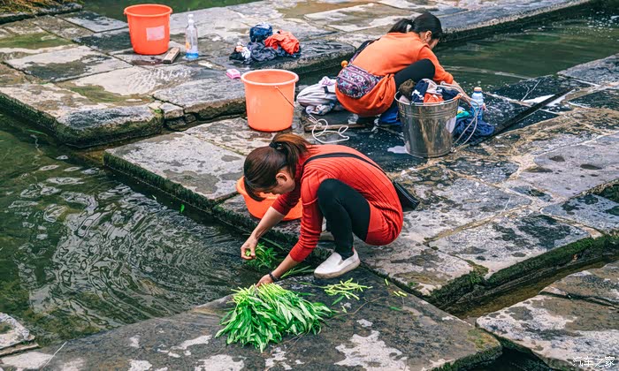 十几米的地面凿成了几个方块。按不同的功能分为饮用水、洗手池和洗衣池。