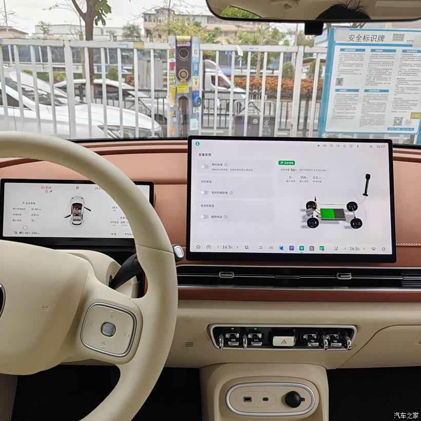 我觉得这车方便最大的原因是车子小,停车确实省事,当时选它一半的原因是吃外观的颜,另一半就是觉得代步车不用太大,好开好停就行。外边的充电车位,一把方向直接就停进来了。充电口在车头,充完电要倒着出去确实有点不习惯,不过好在好猫车身小,加上中控屏的全景影像是挺清楚的,所以倒车出库还挺简单的。
