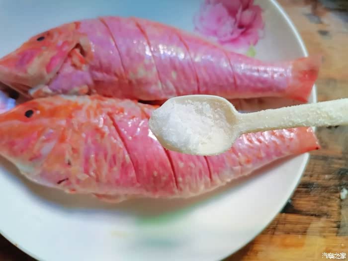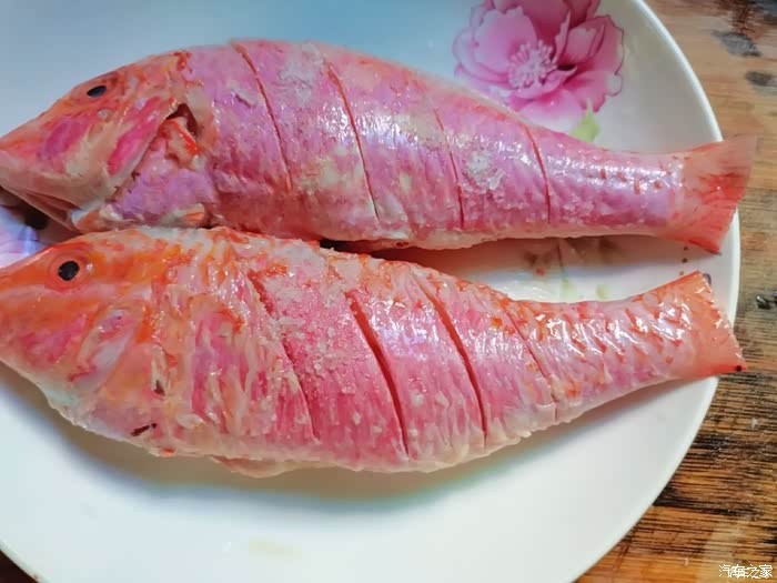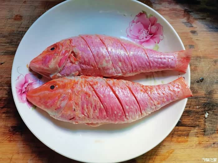 1.打理干净红杉鱼,厨纸吸干多余水份,鱼身切一字花刀方便入味。