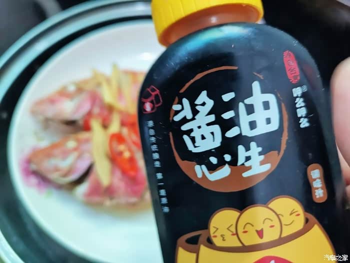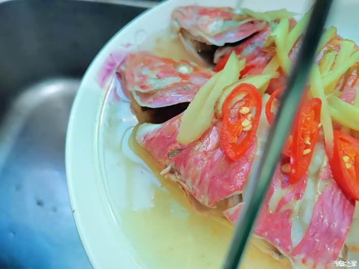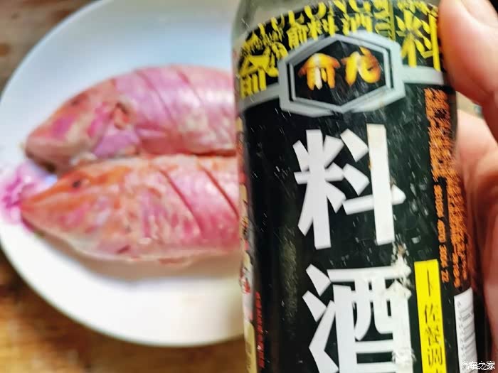 2.切好的姜片码鱼身,调汁,一勺料酒,半勺蚝油,一勺酱油,重口味可以适量多点。