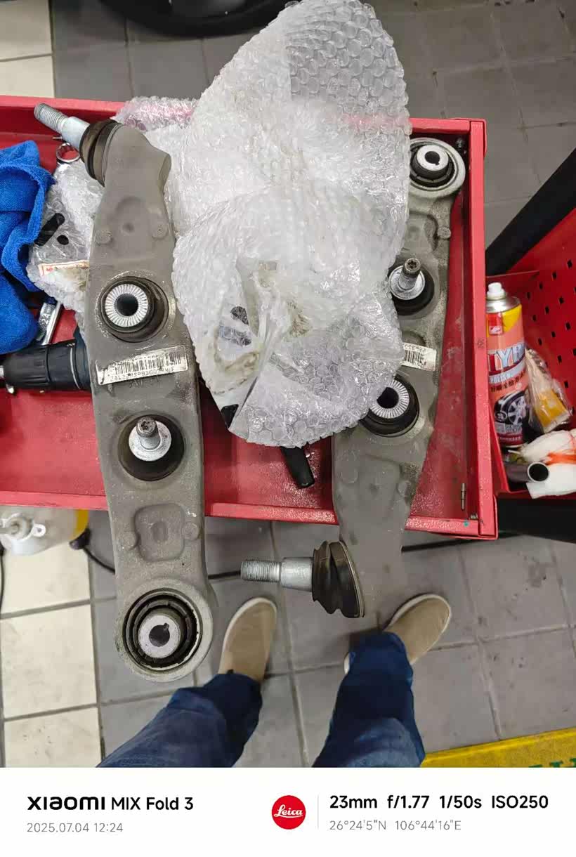 我的车慢速行驶前备箱会有咯噔的异响,后到4 S检查发现是前下拖臂胶套老化,换新后故障消失!!