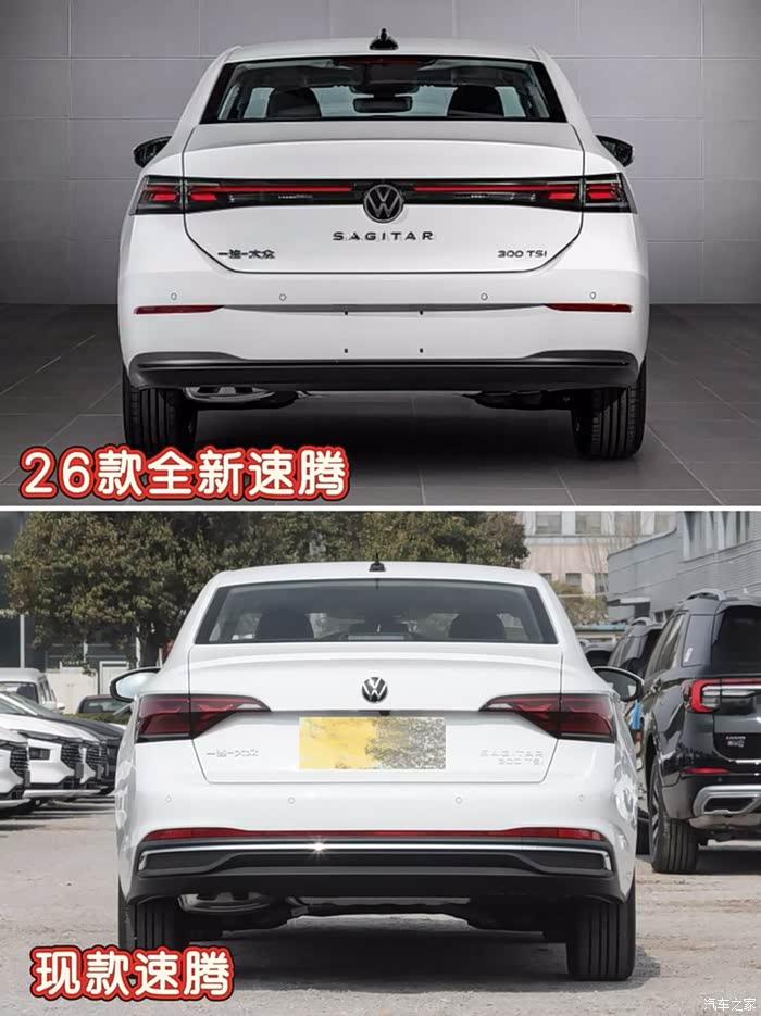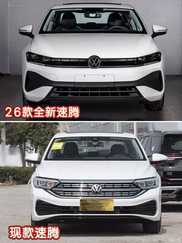 新老速腾的前脸,简直是两个风格。现款速腾的格栅规规矩矩的,虽然经典,但是看久了就觉得有点乏味,整体比较中规中矩。全新一代速腾NF就不一样了,它用的是扁平化简洁格栅,加上向两边延伸的水平线条,一下子就让前脸看起来更宽,整个车有种低趴的感觉,运动范儿十足,攻击性满满。
