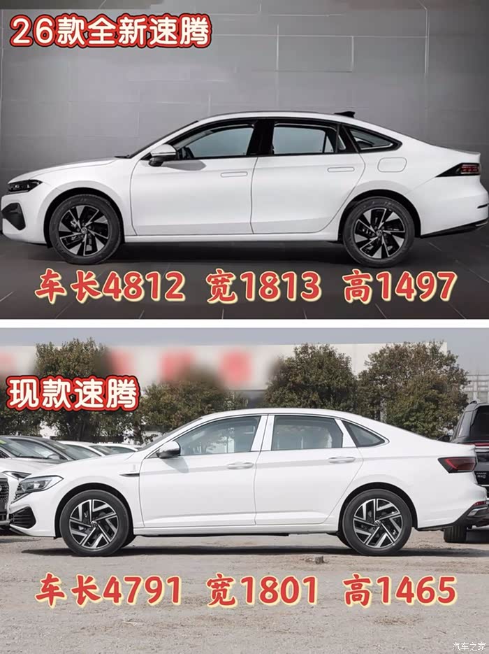 转到车身侧面,这两款车的差异也很大。现款速腾是传统三厢轿车的样子,线条直来直去的,保持着经典轿车的造型。全新一代速腾NF就大胆多了,采用轿跑式溜背造型,线条顺滑流畅,把车身比例衬托得又修长又优雅,时尚感和动感都有了。