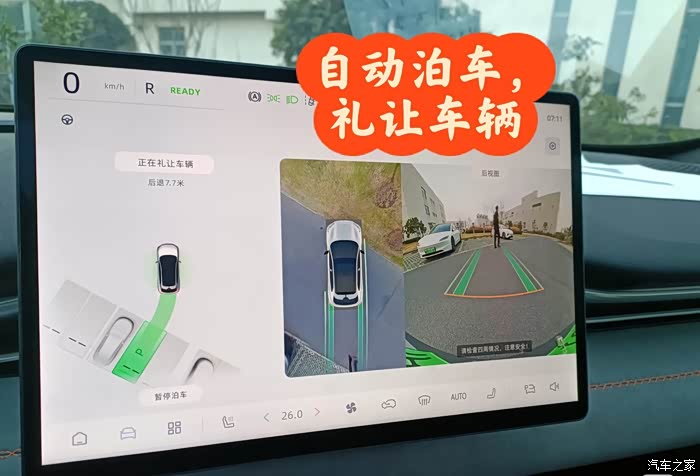 另外也试了自动泊车,车子对车位寻找还是比较快的,对于白线车位识别很快,对于铺砖车位不是很行,不过有些淡黄线也能识别出来。选中可停车位后,基本就可以托管了。自动泊车会显示提前刹车的线,也会避让行人和车辆。停的位置也很居中,基本是需要调整两把方向盘进库。有一点比较疑惑的是,交付中心跟我说尽量不要原地打方向盘,可自动泊车全是原地打方向盘[抠鼻R]。