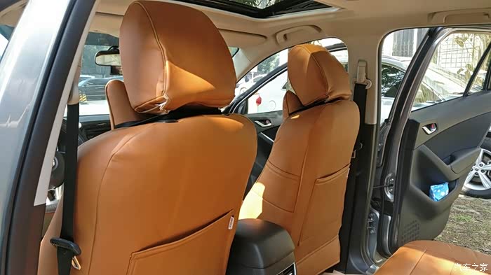 三、改装篇。都市版性价比很高,但缺少倒车影像、胎压监测、蓝牙电话、车顶行李架、真皮座椅、定速巡航等功能,我看好这辆车的原因主要是因为三大件,变速箱AT我喜欢,比双离合、CVT靠谱多了,悬挂成熟稳定,发动机自吸省油耐用。我的第一台车比亚迪所有功能都原厂就有,但质量伤了我的心。总结出电子产品多了都不靠谱、故障率高的感悟,所以我会选这款车。提车是去年底,大概订车半个月就通知我提车了,还是比较神速的。提车当天下午就开始了第一项改装胎压监测,买的伟力通T6C,一个小时搞定,心里安稳多了。我发现马自达不爱装配胎压监测这点要批评。看还有时间又跑到另一家加装皮座椅套,是一家洗车店,淘宝卖家都给我安排好了,装的比较费劲,特别是后排需要把后备箱拆掉才能安装,花了两个小时才安装好,这颜色卖家叫卡宴棕,自己喜欢就行了,几百元钱能用几年就够本了。