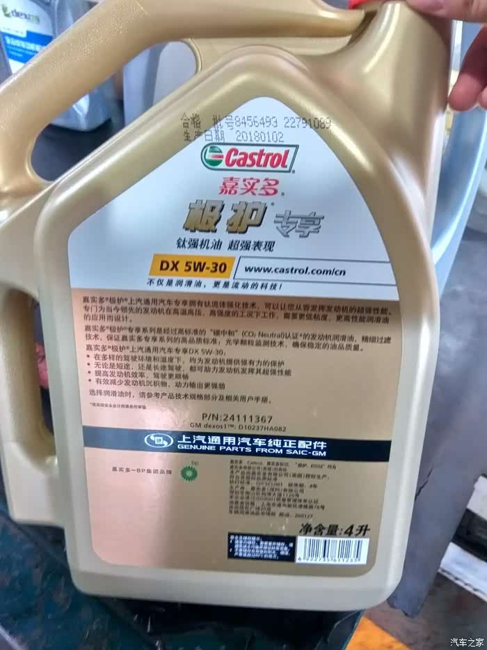 车子开进车间之后,车间师傅先把车子垫上一次性脚垫,打开机器引擎盖,检查了检查,接着车子就被起降机吊了起来了,放了旧机油, 放旧机油的同时师傅还对四个轮胎进行了充气,我还仔细看看了首保送的机油,上面写着是全合成机油,不过我也不是很懂这个,就拍了几张照片让大家帮忙看看这机油咋样。