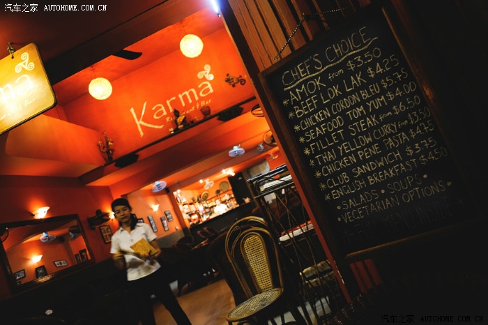 在一家叫《karma》的餐厅坐下,餐厅有着着桔红的墙壁,复古的壁灯,老旧的餐桌以及似有若无迎风飘来的音乐。