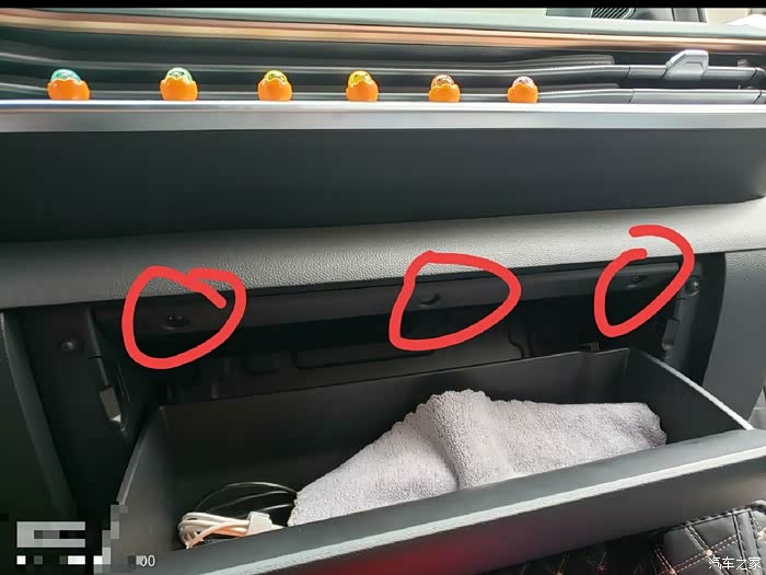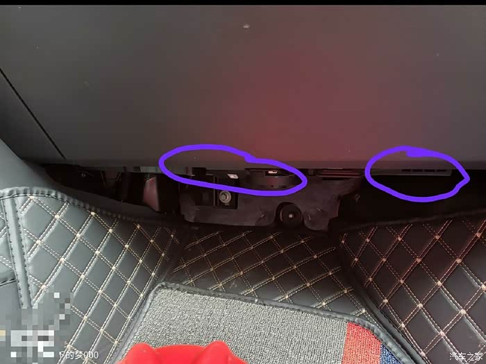 手套箱拆卸(空调滤更换):拆图2黄色阻力杆,直接往外拨出膨胀链接开口轴,拆图3紫色位置两根圆柱销,横向直接拔出,拿下手套箱,拆图1红色三颗螺栓和图2蓝色两颗螺栓(手套箱左右各一个颗)