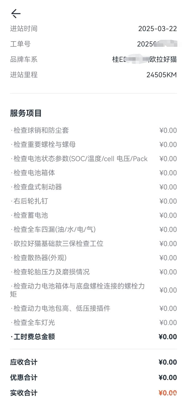 ? 保养项目:通过长城汽车APP能实时追踪保养进度,我的好猫第三次保养(24505KM)花费0元,包含: