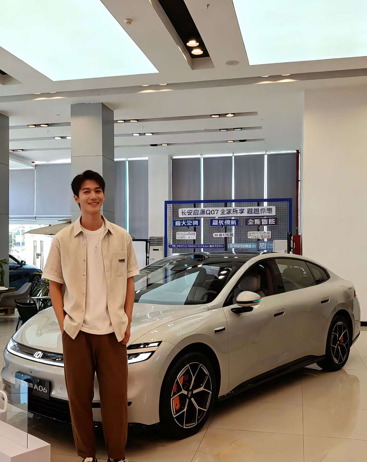 店里一款叫启源A06的车停在显眼位置,我弟先凑过去看,说外观跟他之前念叨的小米汽车比,看着一点不逊色。我俩拉开车门坐进去,内饰没太多花里胡哨的设计,却透着股精致劲儿,屏幕和按键的布局看着很清爽,科技感很足。车身线条是那种利落的运动风,尤其是无边框车门和半隐藏式门把手,我弟摸着车门边说“这设计还挺酷”。