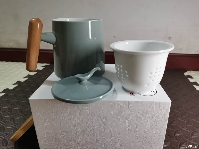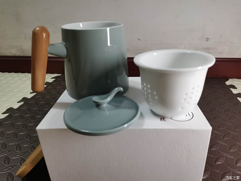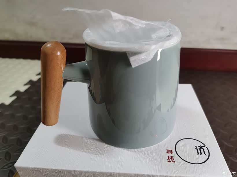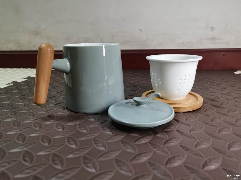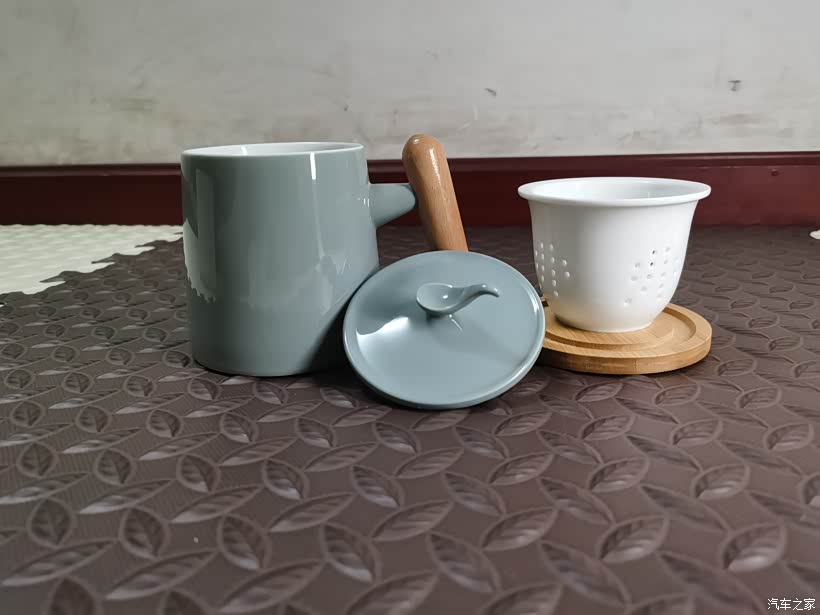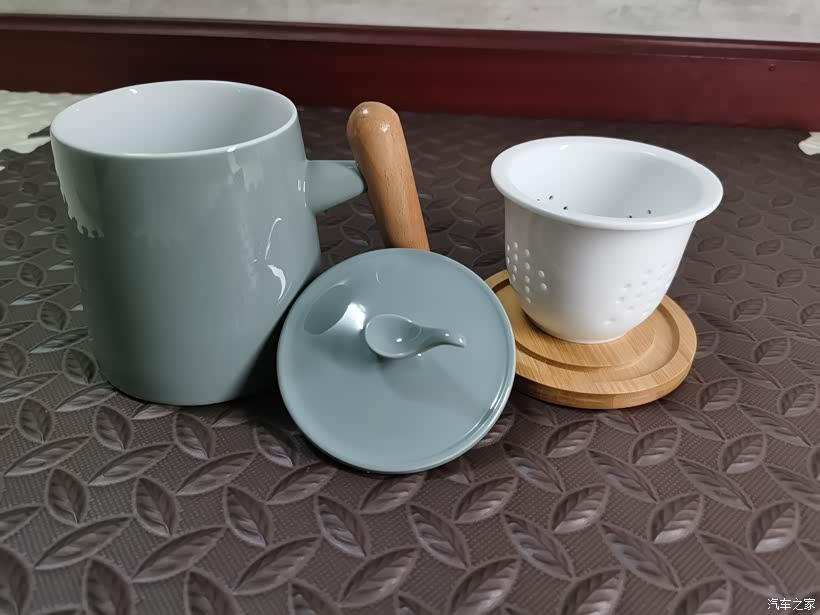 茶杯是青蓝的,在白色过虑杯的衬托下,显得更加素雅。