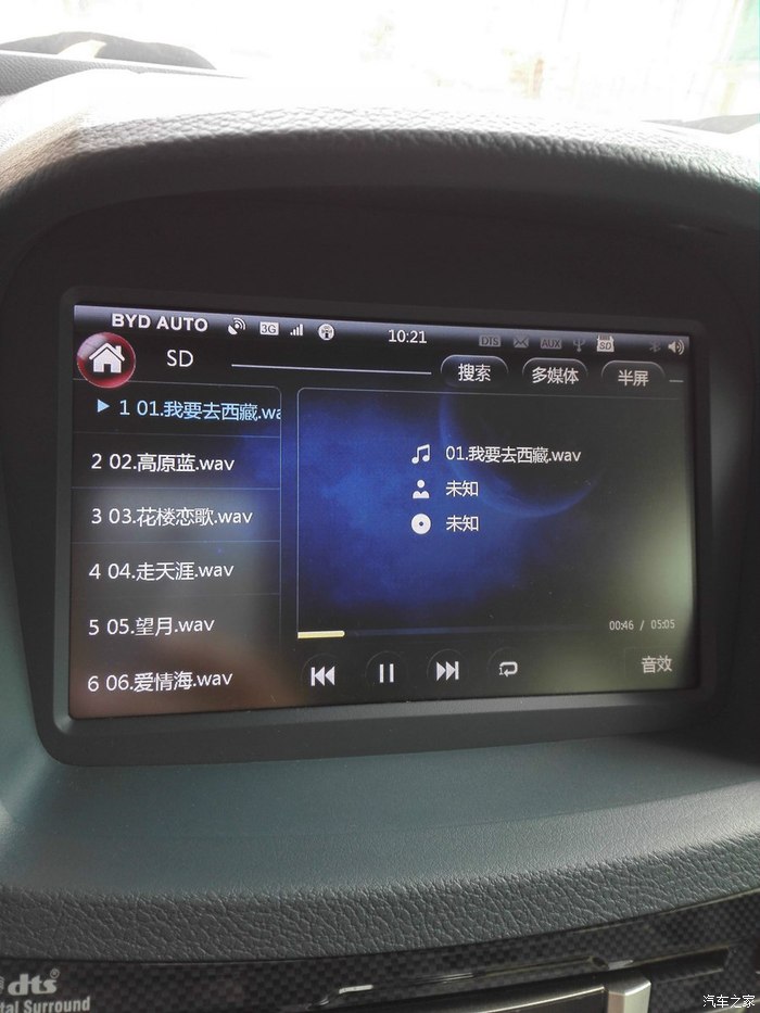 为了压榨秦音响音效,尝试过购买碟片,自己刻录CD和DVD光盘,存放各种格式到SD卡,我的结论是:音源比格式重要!有些歌曲显示的是DTS,音质平淡如水,感觉就像普通的MP3,无意中下载了某个车友提供的WAV格式音乐,放SD卡里直接播放,那种环绕身临其境的效果才是真正体现出秦音响的功底、
