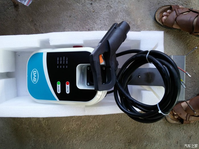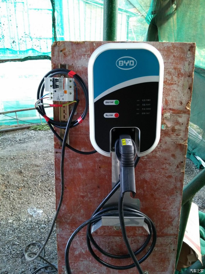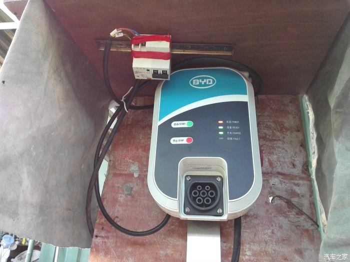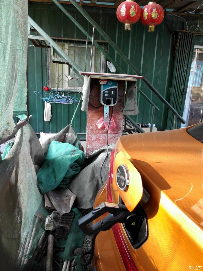在建材市场有自己的档口,充电还是非常方便的,独门独院,既不用担心熊孩子也不怕小偷,所以我的充电桩就变成了下面这个样子,史上最简陋最山寨的充电桩有木有?车库顶上已有铁皮遮风挡雨,简单的找块规则的旧模板搞定了,为了防暴雨这两天稍稍做了修改。我的充电功率显示的是1.8-1.9KW.。这也不纠结了,基本上都是晚上充电白天用车。