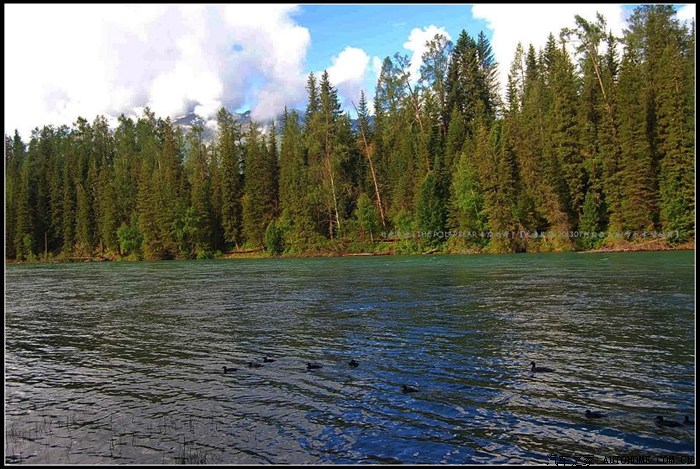 ~~~由东往西一路奔腾不息的喀纳斯河水~~~时而有类似‘鸳鸯’的水鸟~~~在宽阔奔流的河面上顺水漂游~~~~